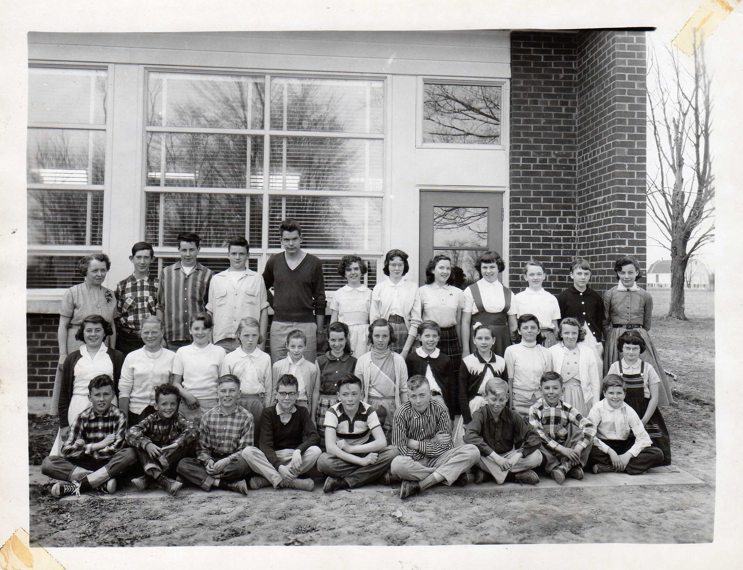Class photo from Big Bay Point School for the 1957 to 1958 school year. Pictured from left to right, back row: Teacher Mrs. Drucilla Holman (née Poucher), Larry Keast, John Dobinson, Gaye Irwin, Bob Davies, Judy Dallimore, unknown, Miss Middleton, Miss Goodyear, Pat Charpentier, [first name unknown] Penman, and Kathy Burton. Middle row: unknown, Tina Raedts, Jackie Gilliland, Hilda Charpentier, Janet Fairchild, Marvella Pitcher, Sue Gill, Janet Penman, Connie Wright, Sandra Willoughby, Lois Kelly, and Margaret Jobbitt. Front row: unknown [possibly David Randall], Eber Ayotte, Ken Green, Bob Charpentier, Bill Warnica, Gord Lee, Bernard Warnica, Ernie Warnica, and Fred Gilliland.