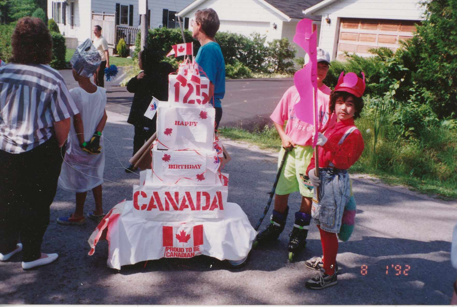 Photo taken during the 1992 Alcona Beach Club parade showing a small float in the shape of a cake that reads "Happy Birthday Canada" for the 125th anniversary of confederation.