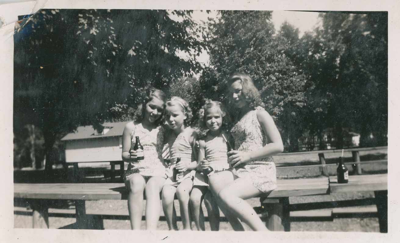 Photo of four girls sitting on a park bench drinking pop from glass bottles in Innisfil Park in 1944. They are identified as Gladys, Flo, Shirley, and Lil.