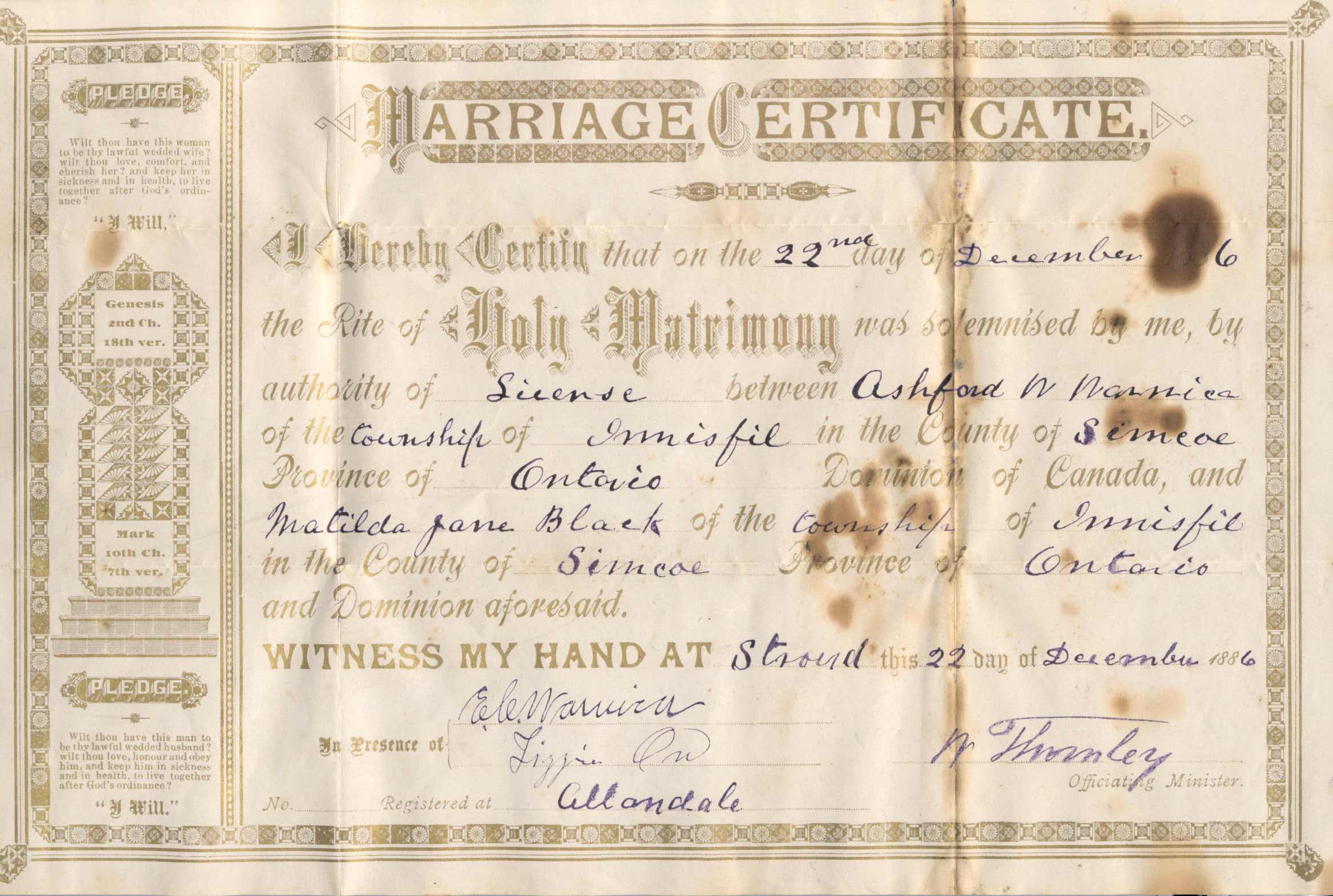 Copy of the marriage certificate of Ashford Wesley Warnica (16 April 1864 - 13 December 1950), son of Samuel Wesley Warnica and Martha Hannah Montgomery to Matilda Jane Black (1866 - 7 January 1893), daughter of William Black and Hester Ann Wilson. The document reads: "I hereby certify that on the 22nd day of December 1886 the Rite of Holy Matrimony was solemnised by me, by authority of License between Ashford W Warnica of the Township of Innisfil in the County of Simcoe Province of Ontario Dominion of Canada, and Matilda Jane Black of the Township of Innisfil in the County of Simcoe Province of Ontario and Dominion aforesaid. Witness my hand at Stroud this 22nd day of December 1886." The document is signed by two witnesses, registered at Allandale, and the officiating minister is W. Thornley.