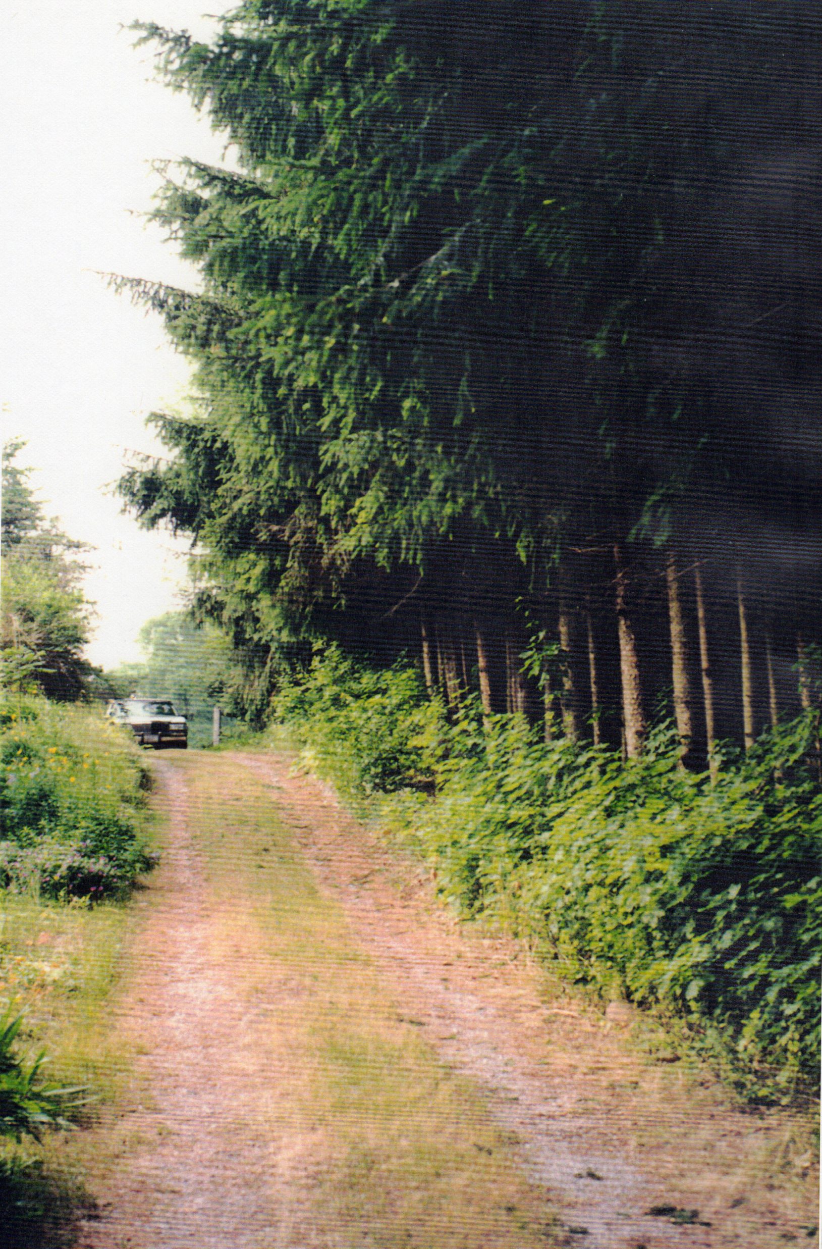 Photo of the tree-lined driveway leading to the cottage known as Triple Dip. The log building was constructed in 1922 by Charles Langley, the first graduate of the School of Architecture at the University of Toronto in 1882. Langley's grandfather had built St. James Cathedral in Toronto, many banks, part of the St. Lawrence Market, the Necropolis, and many other notable sites. Langley's granddaughter, Elizabeth Davidson (née Langley) spent time at the house as a child, eventually became an architect herself, and purchased the home located on Guest Road. After Geraldine married J. Fraser Coate, a Canadian innovator and pioneer of pensions who had helped develop Registered Retirement Savings Plans (RRSPs) and was the first Canadian to have such an account, several additions were made to the home including a dining room, kitchen, guest houses, and pool. In 1995 the property was purchased by the Harrison family. This photo was taken between 1995 and 1997 by Christine Harrison as part of a plan to refurbish the log home, and eventually made its way into a scrapbook given to Walter Warnica, who had worked at the property since 1951.
