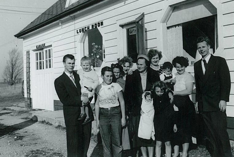 Photo of members of the Gould family with friends visiting from the Sudbury area. Pictured near the right, holding her child Jack Gould, is Mrs. Kenneth Charles Gould (née Anne Theresa Lisik). In front of her holding a doll is Ken and Anne's daughter, Colleen Shirley Gould. Third from left wearing jeans and a t-shirt is their son Garnet Kenneth Gould. Ken and Anne purchased the former Kingsmount gas bar, snack bar, and tourist cabins from Donald Moyes on 15 June 1953 for $12,800. They changed the name to Kenney's Service Station and switched from British American to Supertest gasoline. This photo was taken outside of the lunch room and garage area of the business. Photo credit to Wendy (Corner) Gould.