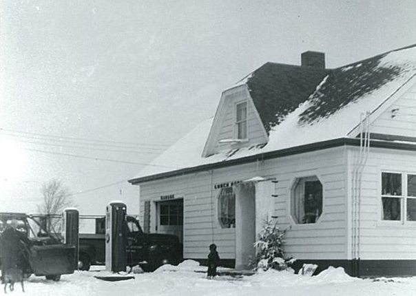 Photo of Kingsmount/Kenney's Service Station taken in the 1960s during the winter. Kenneth and Anne Gould purchased the former Kingsmount gas bar, snack bar, and tourist cabins from Donald Moyes on 15 June 1953 for $12,800. They changed the name to Kenney's Service Station and switched to British American from Supertest gasoline. This photo shows the front of the building with distinctively shaped windows and two gasoline pumps. The branded service station vehicle is parked at the entrance of the garage, with another vehicle to the far left. A small child is standing in front of the door. Photo credit to Wendy (Corner) Gould.