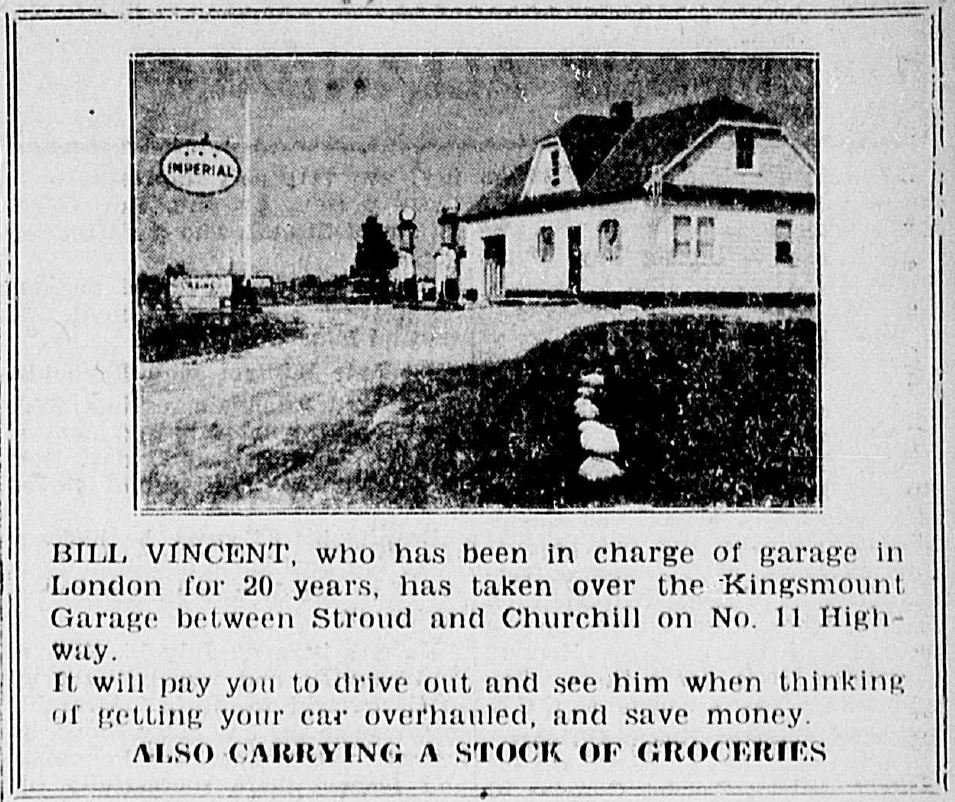 Newspaper clipping featuring a photo of the Kingsmount service station from 21 November 1940. The original Kingsmount burned down in January 1940, and was rebuilt by William Lock. It opened that fall under the management of Bill Vincent. The photo features the distinctive architecture of the main building as well as an Imperial Gas sign and two gasoline pumps. The text reads: "Bill Vincent, who has been in charge of garage in London for 20 years, has taken over the Kingsmount Garage between Stroud and Churchill on the No. 11 Highway. It will pay you to drive out and see him when thinking of getting your car overhauled, and save money. Also carrying a stock of groceries." On 15 June 1953 the Kingsmount gas bar, snack bar, and tourist cabins were purchased by Kenneth and Anne Gould from Donald Moyes. They changed the name to Kenney's Service Station.