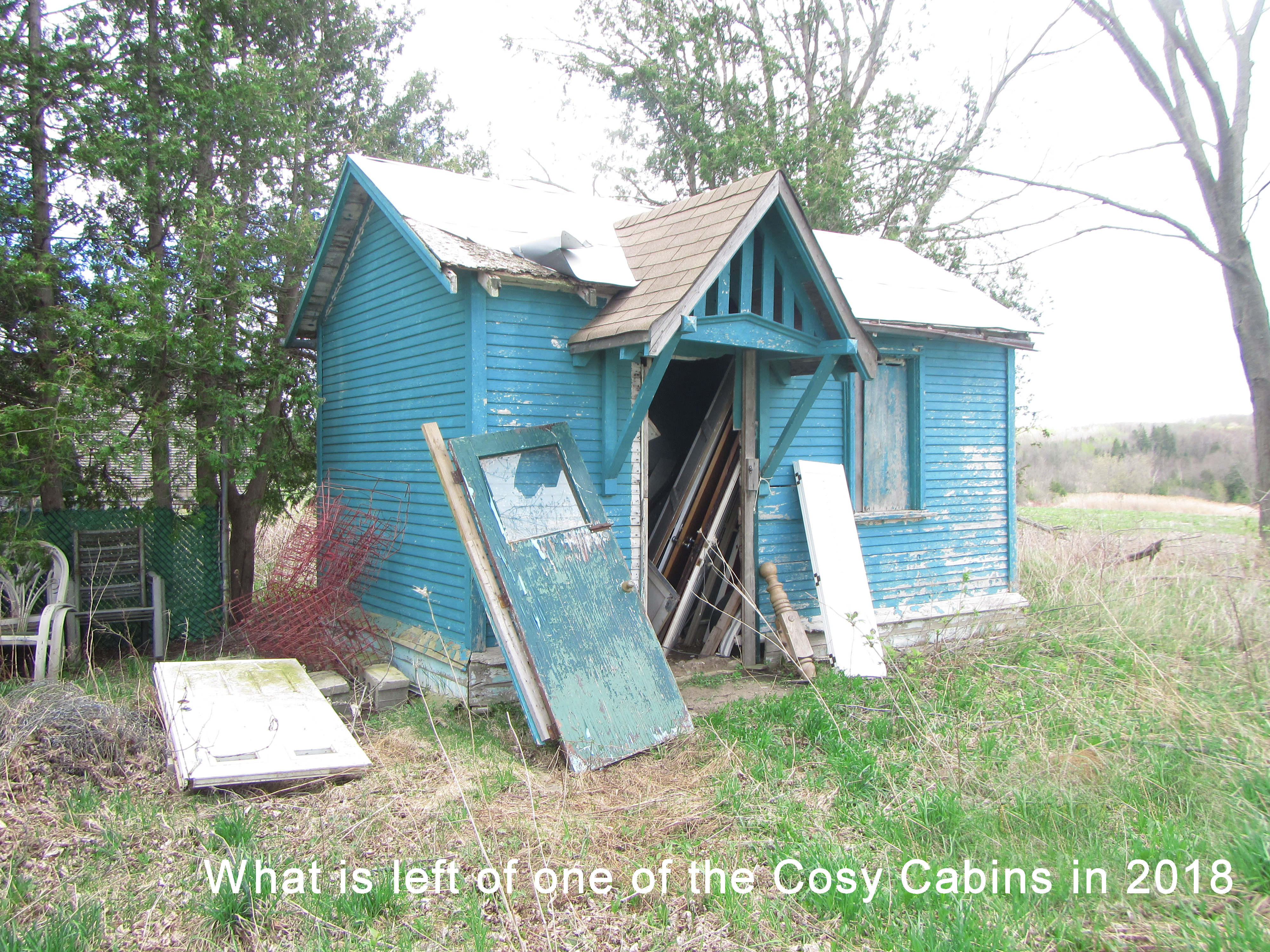 Photo of one of the four former cozy cabins belonging to Kingsmount/Kenney's Service Station that had originally been rented out to passing motorists and tourists for accommodation from its position off of Highway 11/Yonge Street. Originally constructed by William Lock, the property and buildings were eventually purchased by Kenneth and Anne Gould and the Kingsmount name was changed to Kenney's Service Station. As demand for cabins decreased, the Goulds stopped renting them and instead connected two of the cabins, adding in a kitchen and and bathroom, to convert into a long-term rental, and a third cabin was blown away during Hurricane Hazel. This photo from 2018 shows the wear and tear on the fourth cabin after 45 years of disuse.