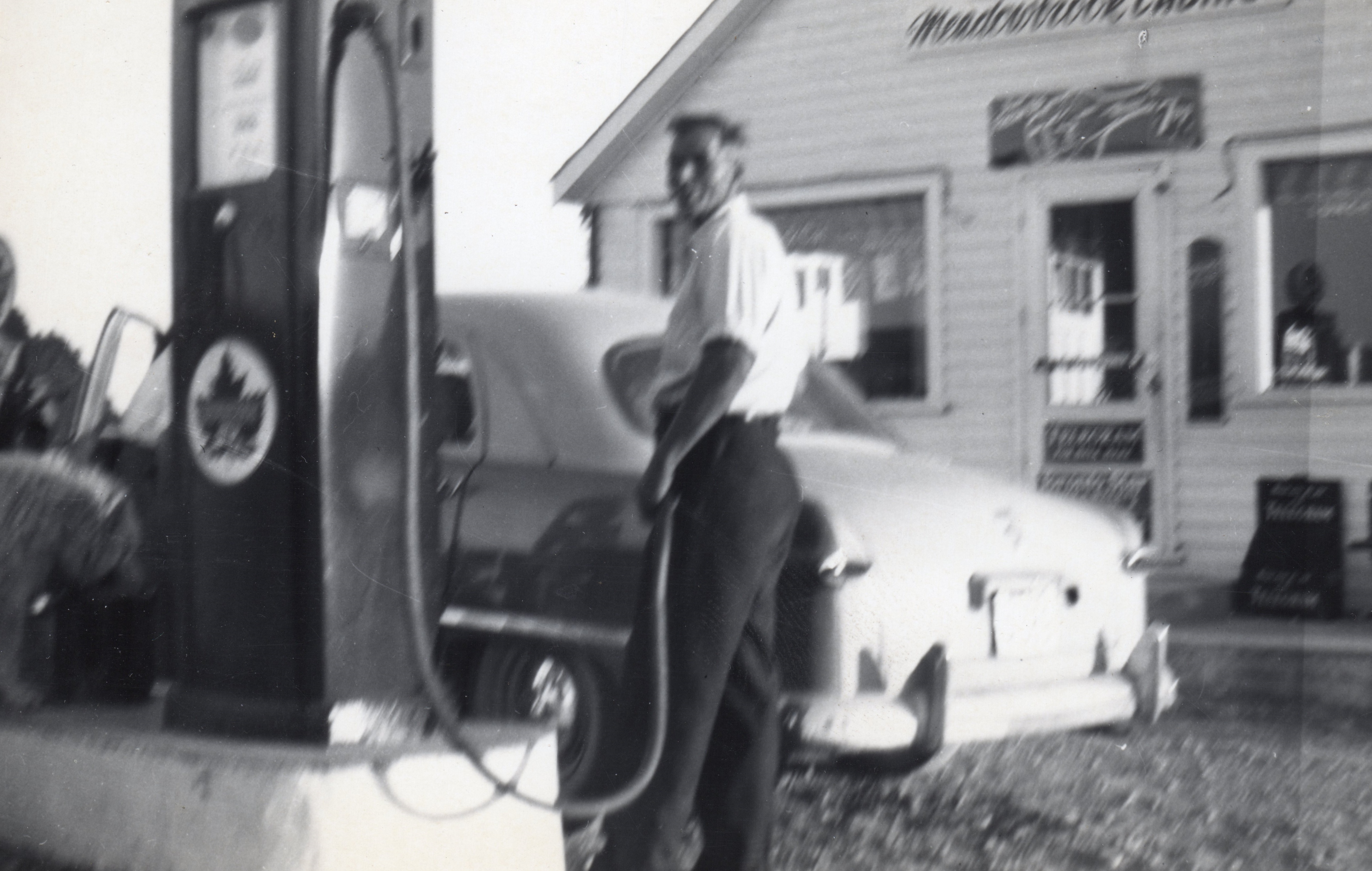 Photo of Albert Cheesman pumping gasoline from a Supertest pump into a car at Meadowbrook. Located on south half of lot 11, concession 14 of Innisfil (now Barrie), Albert built a storey-and-a-half building with a walk out basement, living quarters upstairs, restaurant and variety store on the main level, Supertest gas bar, and cabins to rent out to travelers. About 100 feet off of highway 11/Yonge Street he built a row of three smaller cabins along the north fence line and one large duplex cabin along the west fence line. The establishment was named Meadowbrook, and Albert along with wife Betty (née Bowman) and children Heather and Robert lived there - along with a pony and some chickens - until the business and property were sold in 1952 to Leonard Kearns. Photo credit to Bob Cheesman.
