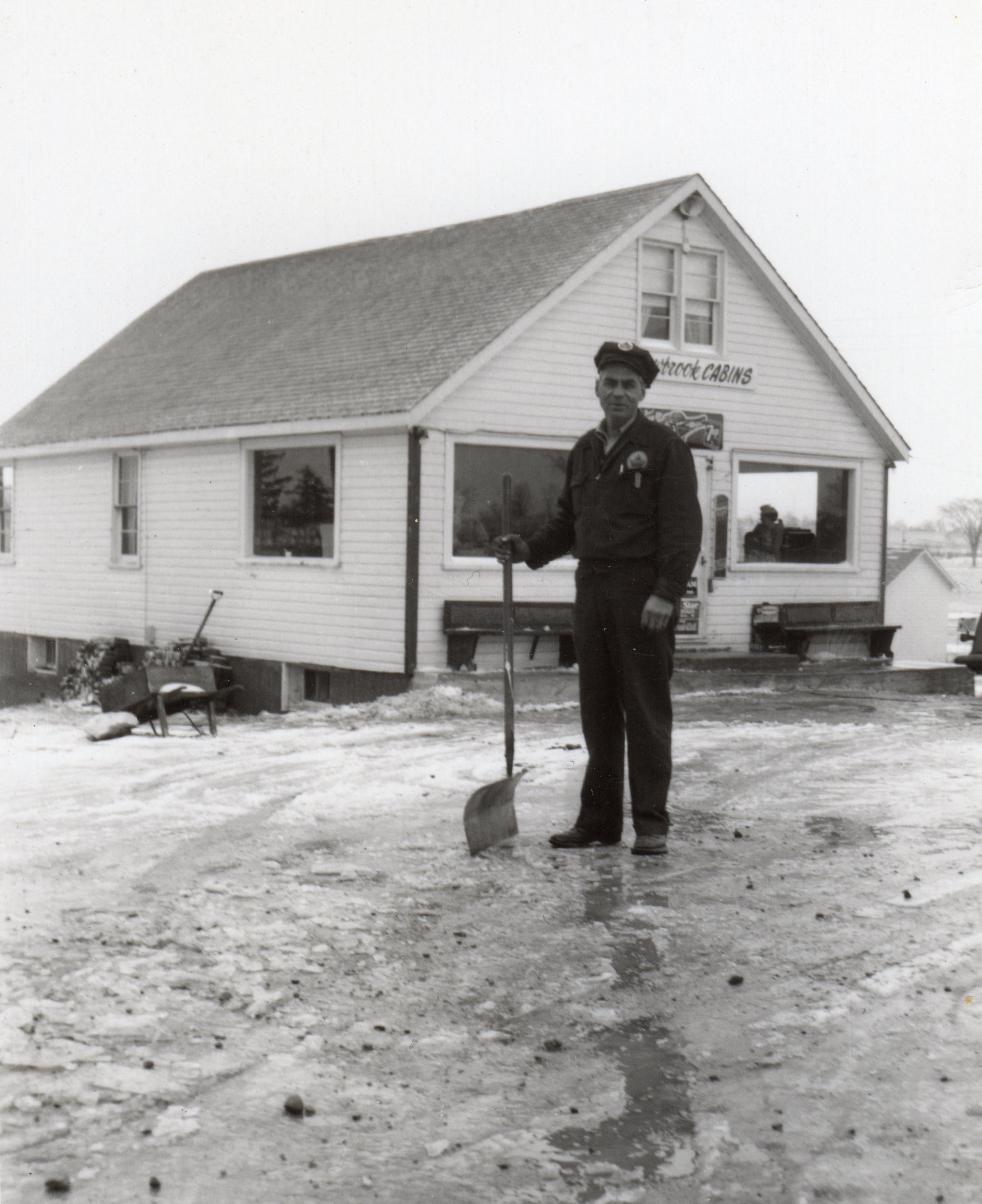 Photo of Albert Edward Cheesman clearing snow from the front of the Meadowbrook main building. Located on south half of lot 11, concession 14 of Innisfil (now Barrie), Albert and his wife Betty (née Bowman) built a storey-and-a-half building with a walk out basement, living quarters upstairs, restaurant and variety store on the main level, Supertest gas bar, and cabins to rent out to travelers. About 100 feet off of highway 11/Yonge Street he built a row of three smaller cabins along the north fence line and one large duplex cabin along the west fence line. The establishment was named Meadowbrook, and Albert, Betty, and their children Heather and Robert lived there - along with a pony and some chickens - until the business and property were sold in 1952 to Leonard Kearns. Photo credit to Bob Cheesman.