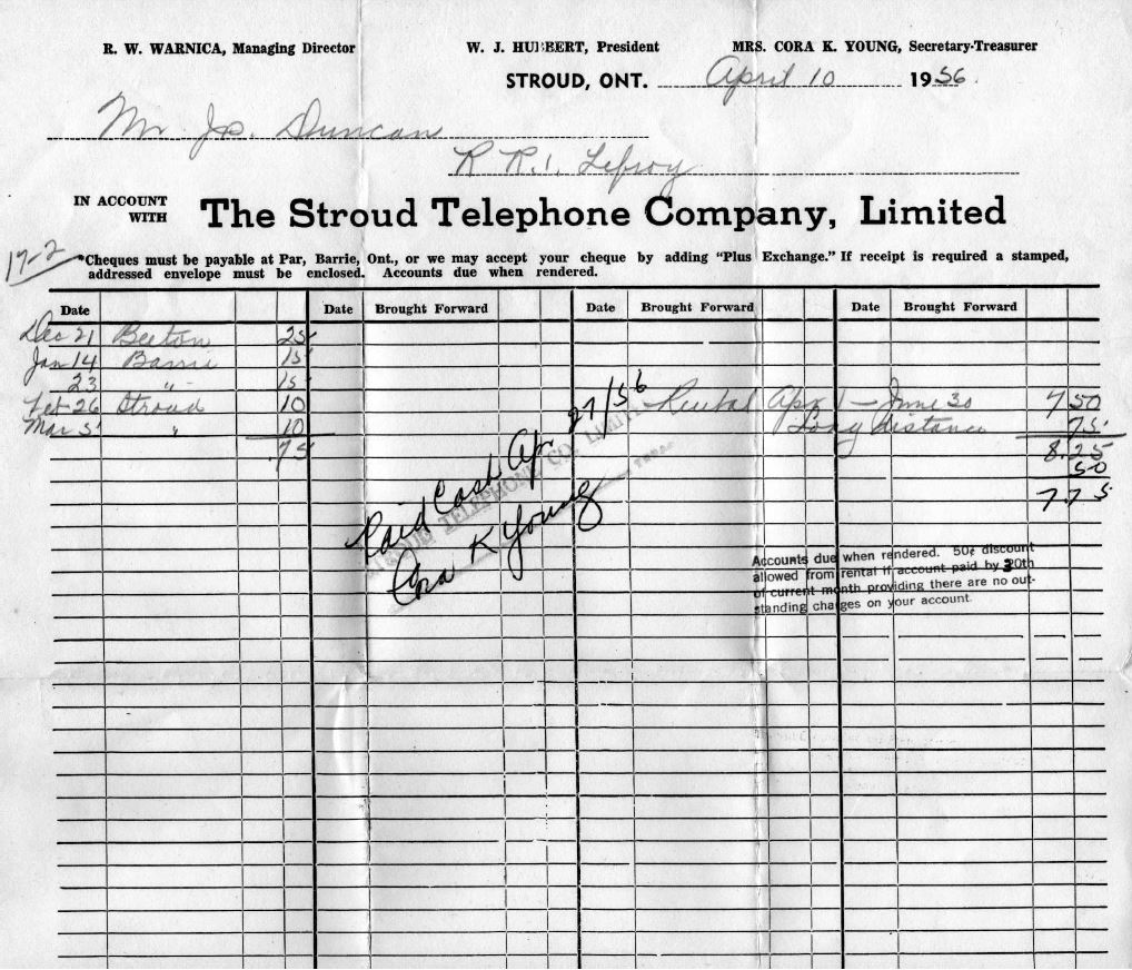 Copy of a bill from the Stroud Telephone Company billed to Mr. Joseph Duncan of R.R. 1 in Lefroy. The bill is dated to 10 April 1956 and the top of the bill indicates R.W. [Roy Washington] Warnica (1896-1963) as Managing Director, W.J. [William James Herrell] Hubbert (1890-1962) as President, and Mrs. Cora K. [Kathleen] Young (née Guest, 1900-1962) as Secretary.