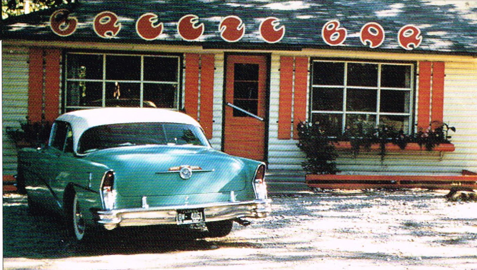 Photo of the entrance to the Breeze Bar restaurant in 1956. The photo shows an orange/red door and shutters below a stylized "Breeze Bar" sign on the roof, and a blue/green 1950s style car parked in front. The Breeze Bar was a restaurant located in Big Bay Point owned and operated by Harvey Gorgan and Milner Barker. It opened in 1954, and was sold to Larry and Betty Hardy on 20 June 1977.