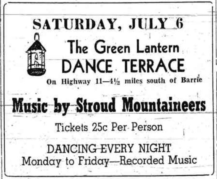 Advertisement for the Green Lantern's dance terrace for Saturday July 6 [year unspecified] when the Stroud Mountaineers would provide live music.The Green Lantern business was located in St. Paul's, Innisfil. Owned and operated by George and Mabel Ransom, the business offered rental cabins, a restaurant, tearoom, grocery store, and Supertest gas bar. With the relocation of Yonge Street to accommodate a more gradual curve in 1952, the business lost its prime location and George was compensated $3000 for loss of business by the Department of Highways. The Ransoms retired and sold the property on 20 September 1985. The entire text of this ad reads: "Saturday, July 6 The Green Lantern Dance Terrace on Highway 11 - 4 ½ miles south of Barrie - - Music by Stroud Mountaineers - - Tickets 25c Per Person - - Dancing Every Night - - Monday to Friday - Recorded Music"