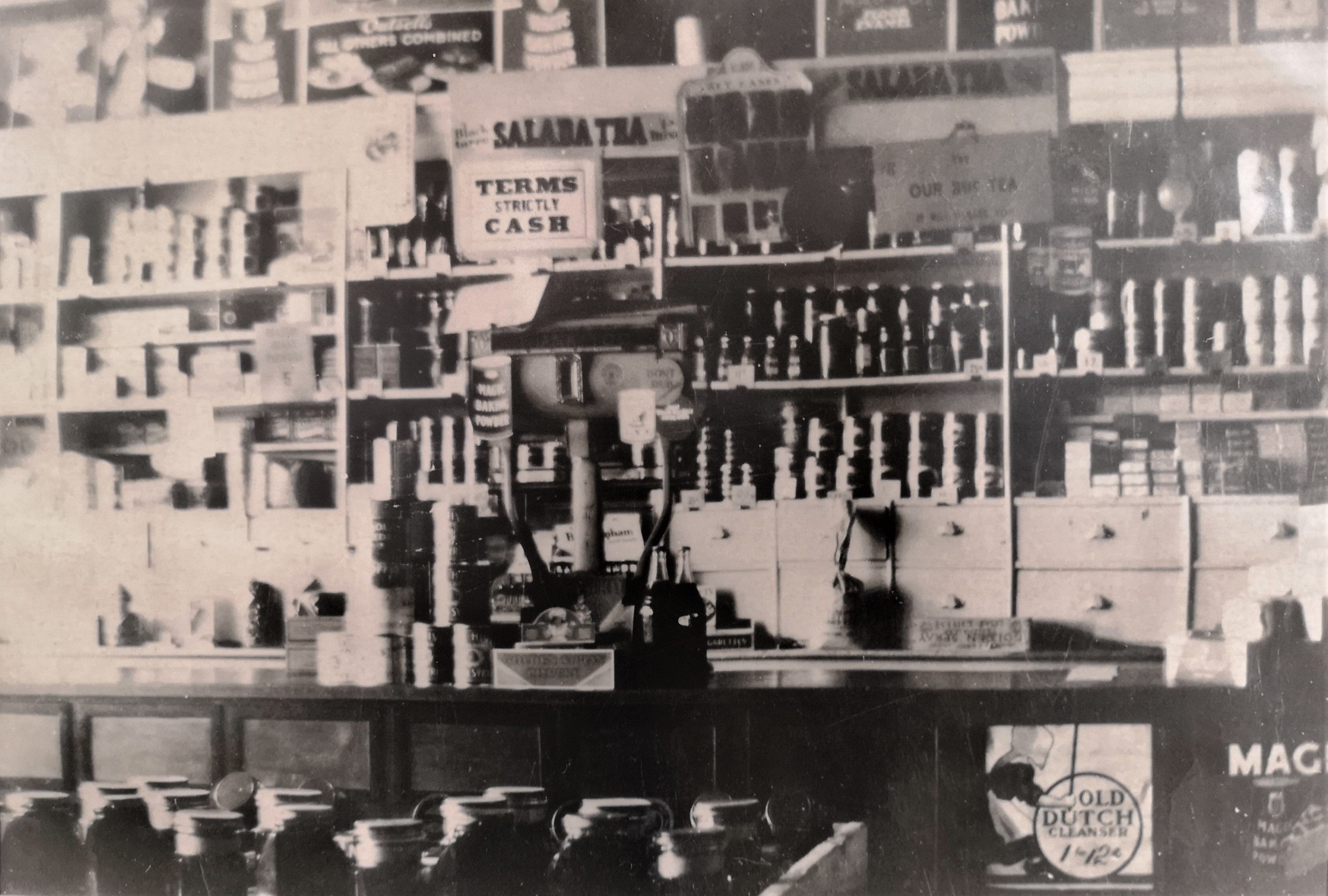 Undated photo showing the interior of the Gilford Store. A variety of bottles, jars, boxes, and cans can be seen behind the counter and in the foreground, with advertisements for Old Dutch cleanser, Magic Baking Powder, and Salada Tea also visible. A copy of this photo was displayed in the Gilford Community Hall for a number of years. James Andrew Blain and Helen (Maconchy) were proprietors of the Gilford store from 1885-1919. James Blain emigrated from Castlewellan, County Down, Ireland, to Gilford about 1876 at age 25 and began clerking in this store, then owned by Squire Thomas Maconchy. In 1882 he married Maconchy's eldest daughter, Helen Amelia, and they moved into the apartment over the store. In 1885 he purchased the store and became postmaster, railway ticket agent, and telegrapher. He also operated a cheese factory, later a creamery, south of the Temperance Hall, and subsequently he donated that location as a community park. In 1919 the store was sold to Mr. and Mrs. Gordon Badger and the Blains retired to Glenholme Avenue in Toronto.