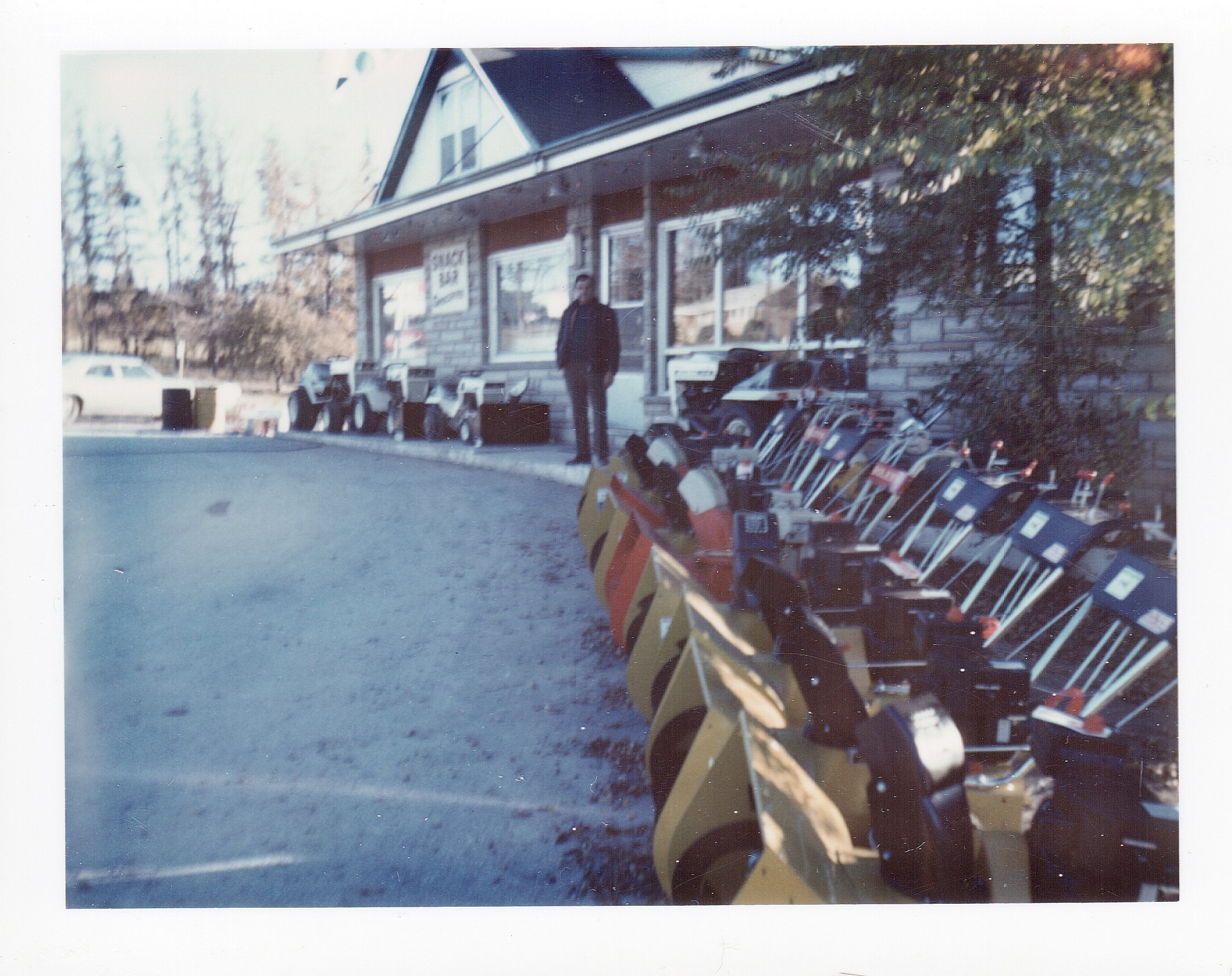 Photo of Peter Cremers, owner of Meadowbrook Cabins, along with the restaurant and bar, standing outside of his business. Peter allowed Cal Madill to display and sell lawnmowers, tractors, snowblowers, and other similar items outside of Meadowbrook. This photo was taken sometime between 1966 and 1978. Cal later purchased his own business in St. Paul's, Innisfil.