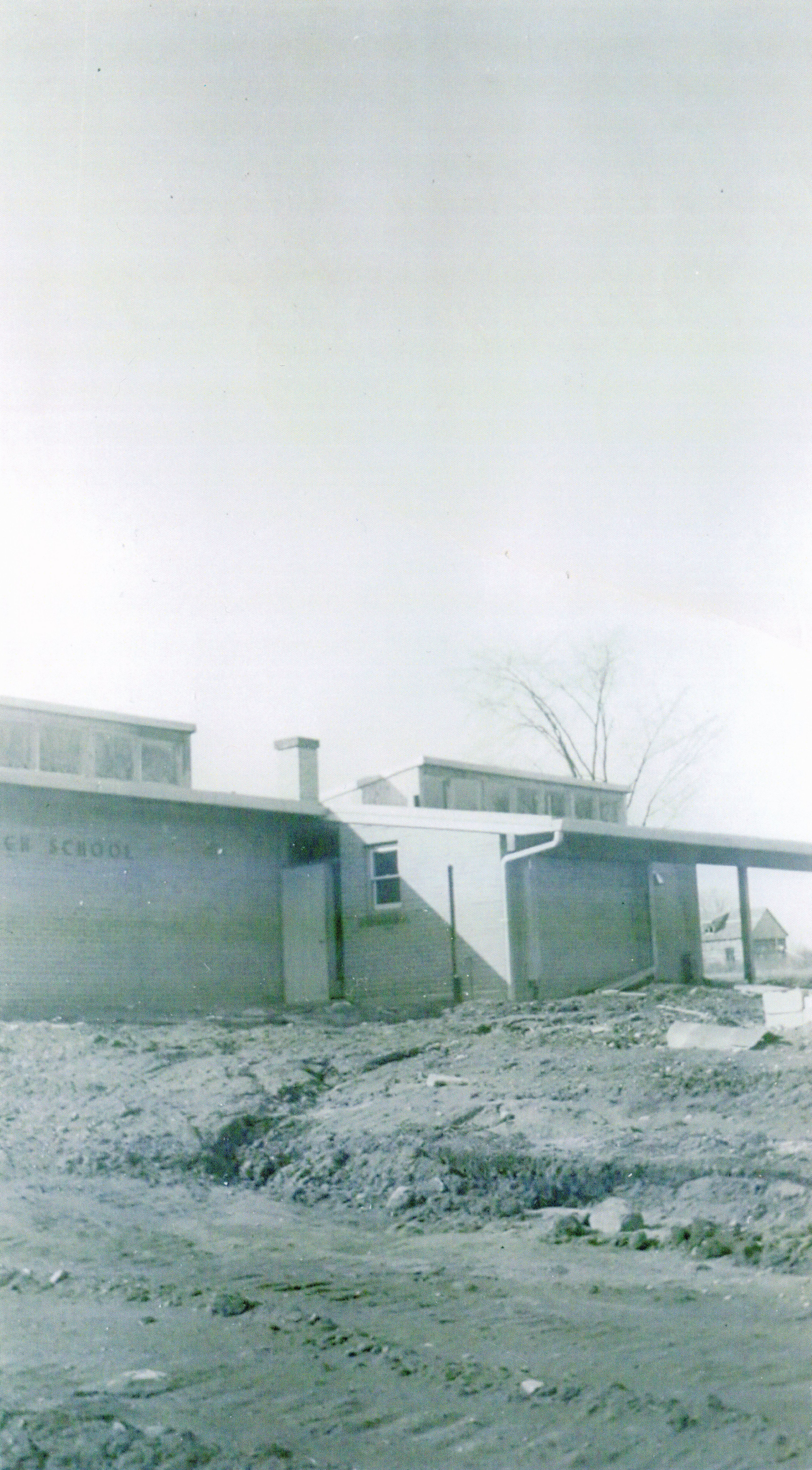Photograph of Alcona Beach Public School while under construction in 1954. A two room building, with no landscaping completed. In 1962, a portable classroom was added.