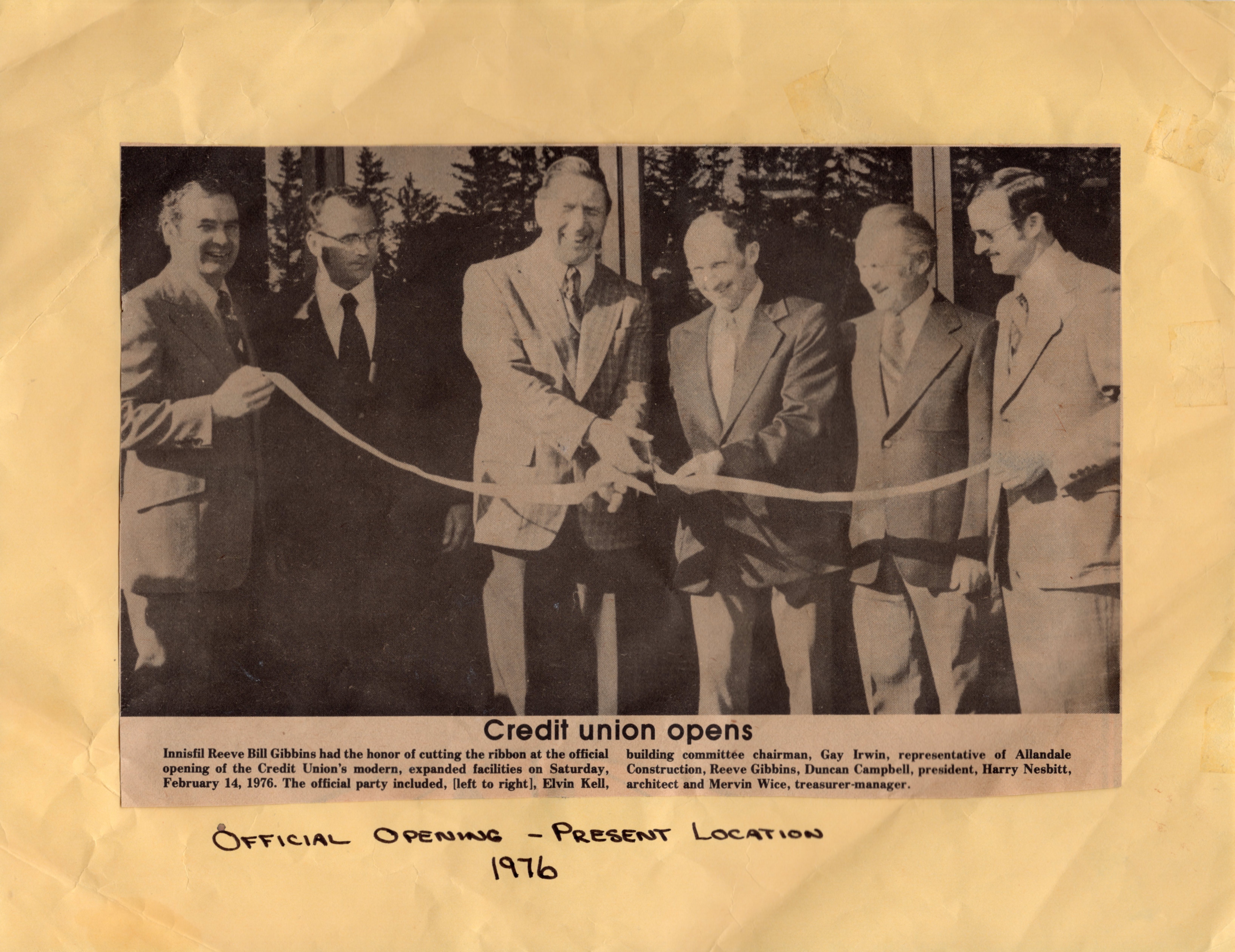 A newspaper clipping with a photo of six men in business attire standing outside, cutting a ribbon. Text below the photo reads “Innisfil Reeve Bill Gibbins has the honor of cutting the ribbon at the official opening of the Credit Union's modern, expanded facilities on Saturday, February 14, 1976. The official party included, [left to right], Elvin Kell, building committee chairman, Gay Irwin, representative of Allandale Construction, Reeve Gibbins, Duncan Campbell, president, Harry Nesbitt, architect and Mervin Wice, treasurer-manager.”