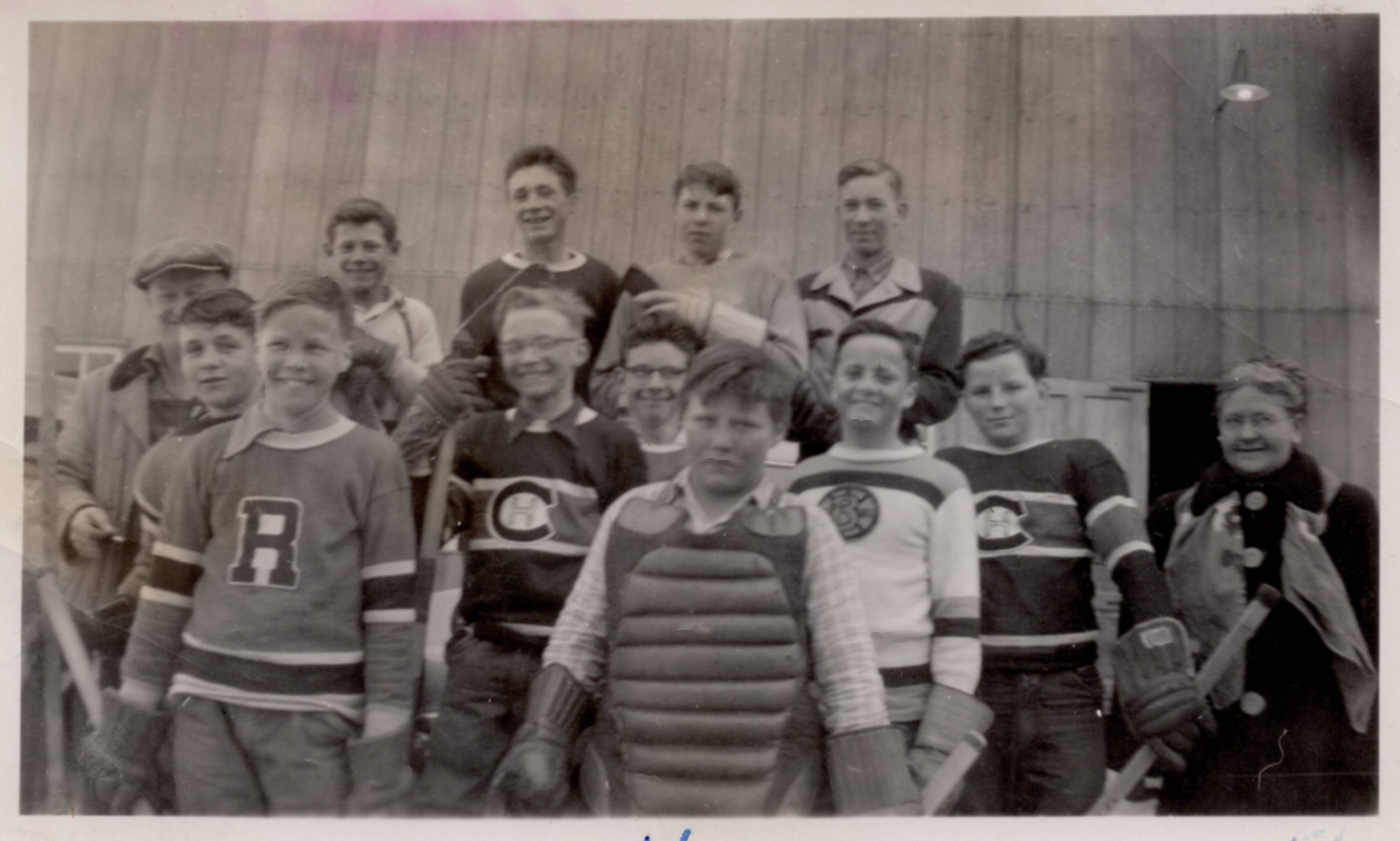 Photograph of boys wearing hockey jerseys and equipment, such as gloves and hockey sticks, outside of a barn.