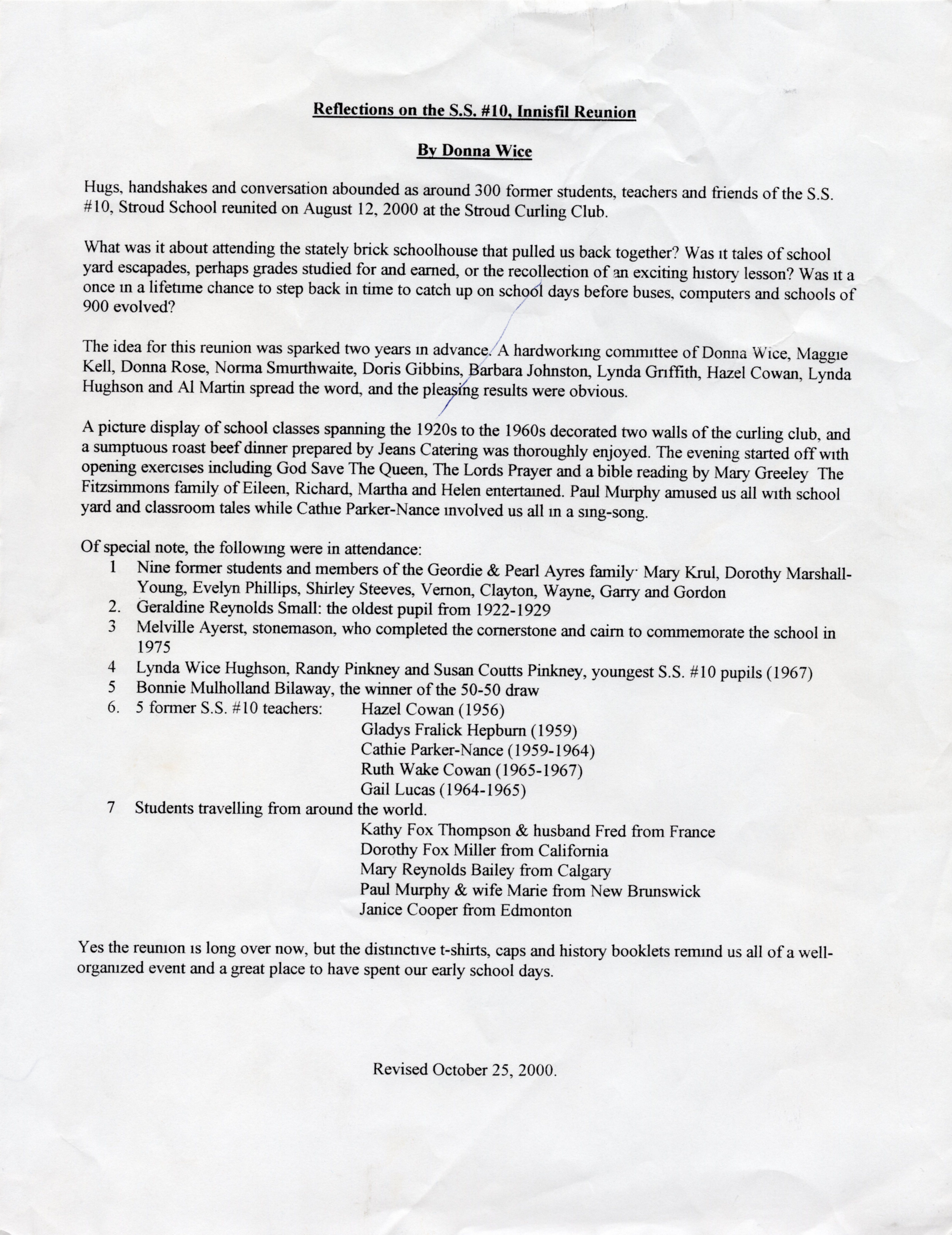 Reflections on the S.S #10 Innisfil Reunion, written by Donna Wise, and revised October 25, 2000.