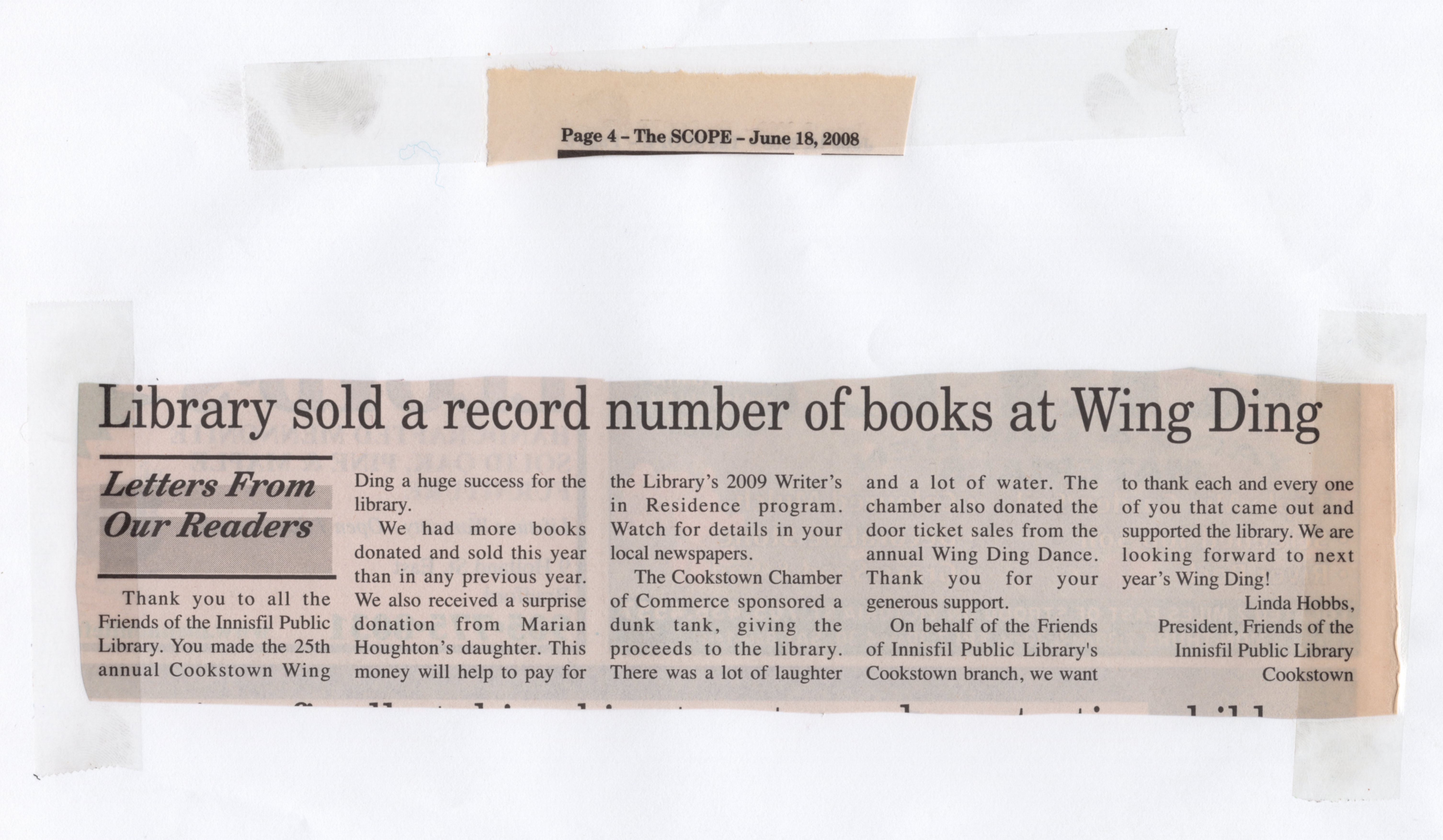 A letter submitted to The Innisfil Scope, by Linda Hobbs, President of Friends of the Innisfil Public Library. The letter discusses the record sales for the amount of books purched at the Cookstown Wing Ding, in addition to other donations.