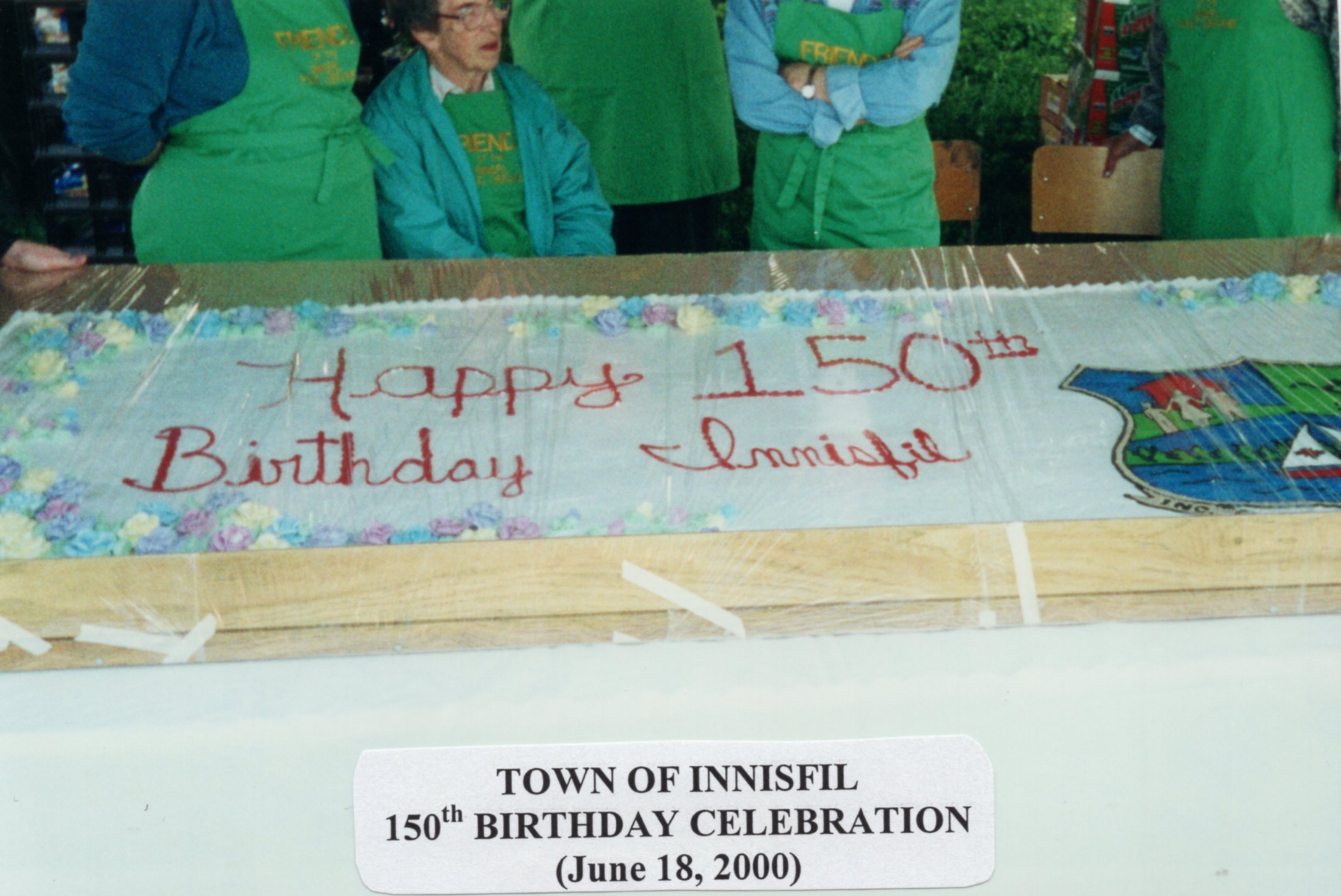 The cake present at the celebration of the Town of Innisfil's 150th Birthday Celebration, June 18th 2000. The cake features frosted flowers and a frosted Innisfil town crest.