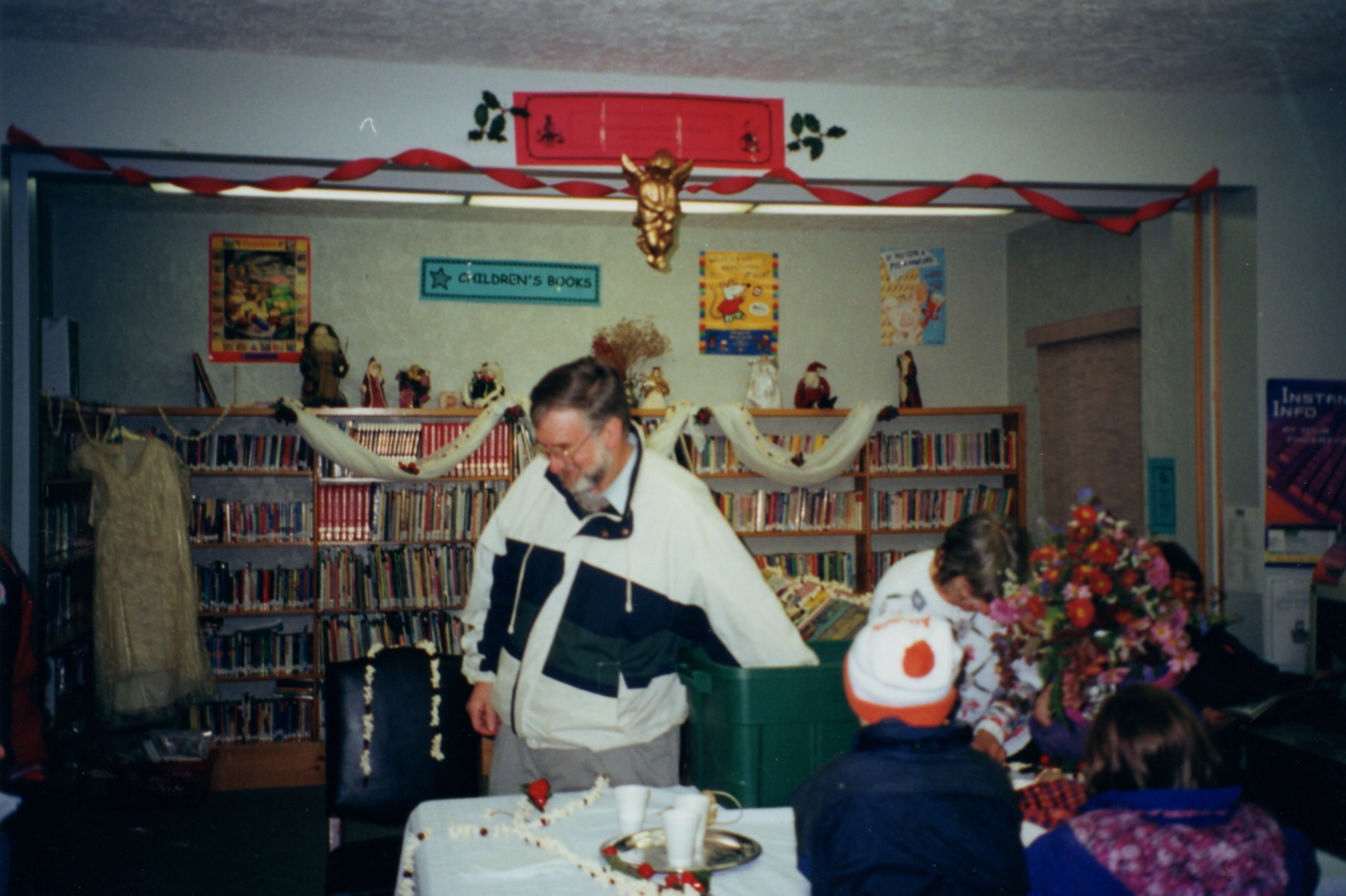 Photograph showing Mayor Brian Jackson in Innisfil Public Library. The interior is decorated with red streamers and pop-corn garland, indicating the photograph could have been taken around the Christmas Holiday season.