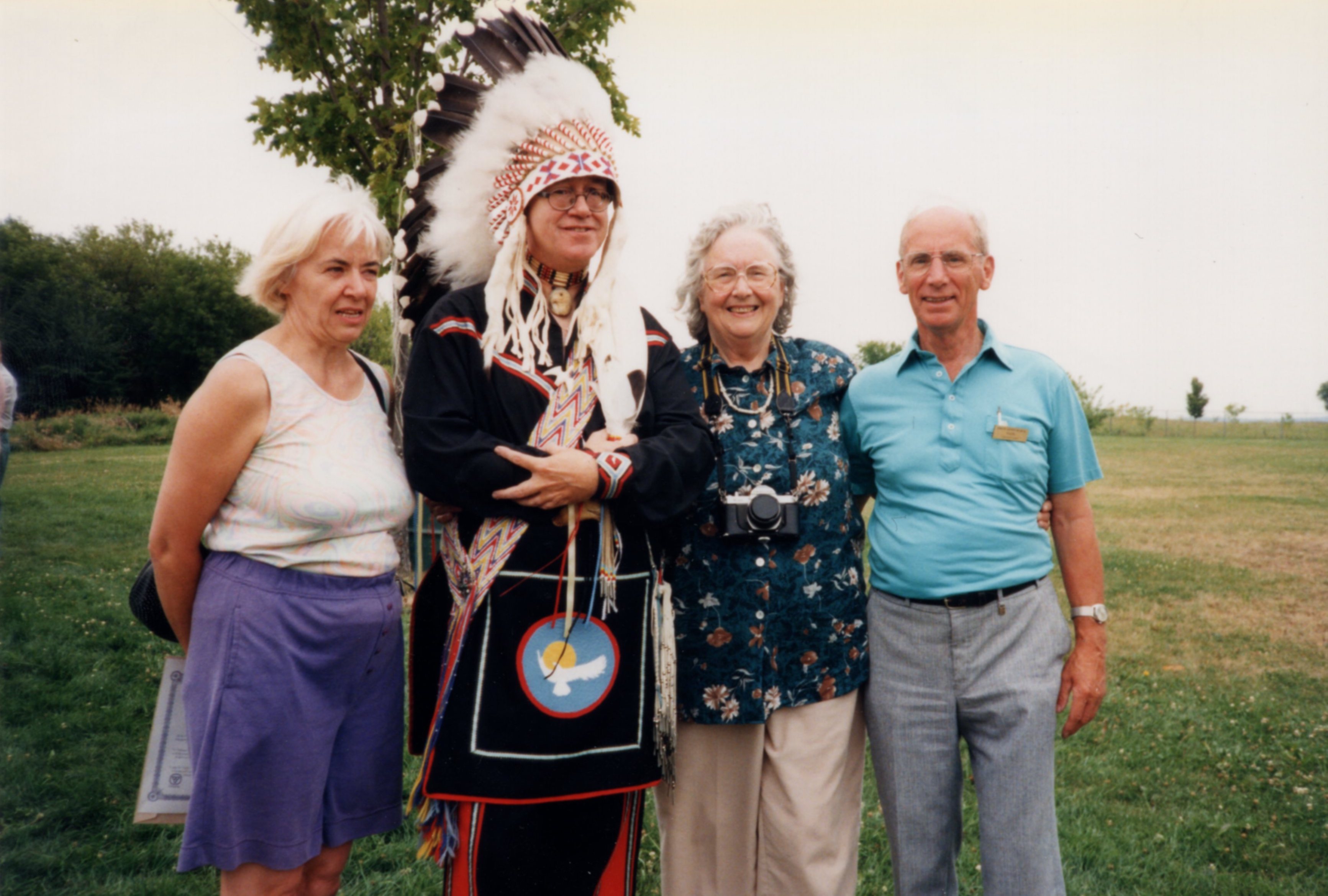 Four unidentified people standing in a field, attending the plaque reveal for Kenneth Earl Kidd. The gentleman second from the left is fully dressed in a traditional Indigenous outfit and headress. The back of the photo is stamped with Brian Baker's information, suggesting he may have been the photographer.