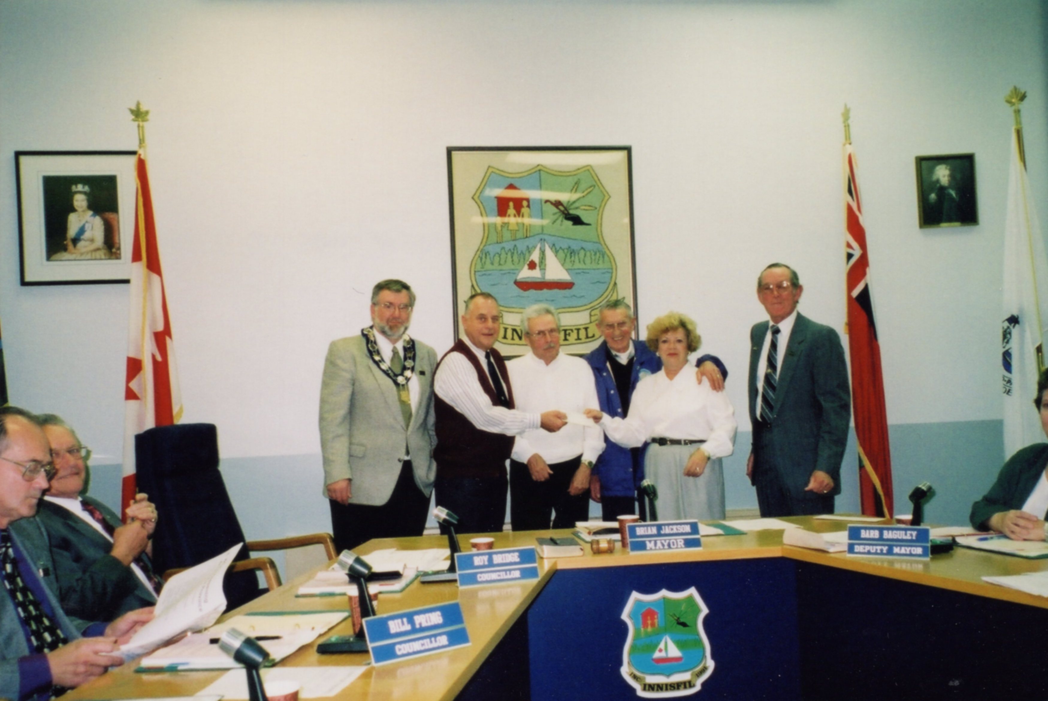 Photograph taken inside of town hall; six people stand behind the desk, under the Town of Innisfil crest that is hung on the wall. It seems that a cheque is being presented by dignitaries of the town of Innisfil to unidentified guests. Mayor Brian Jackson, among others, are present in the photograph.