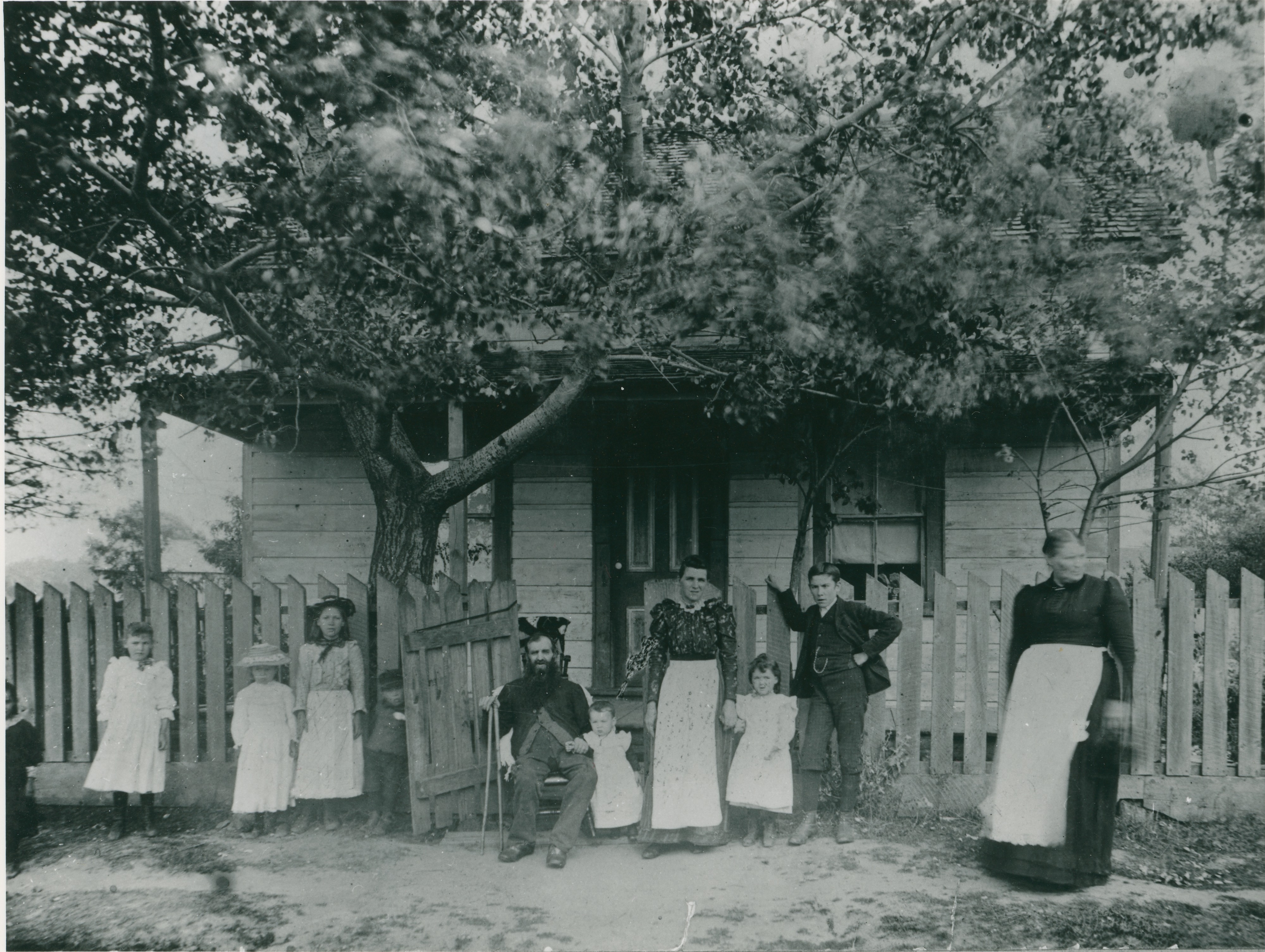 Picture showing different generations of people standing in front of an old house with picket fence. Included in the photo are: John Thompson (seated), Bob Taggart, Mrs. John Thompson, Mary Taggart, and Ettie Taggart