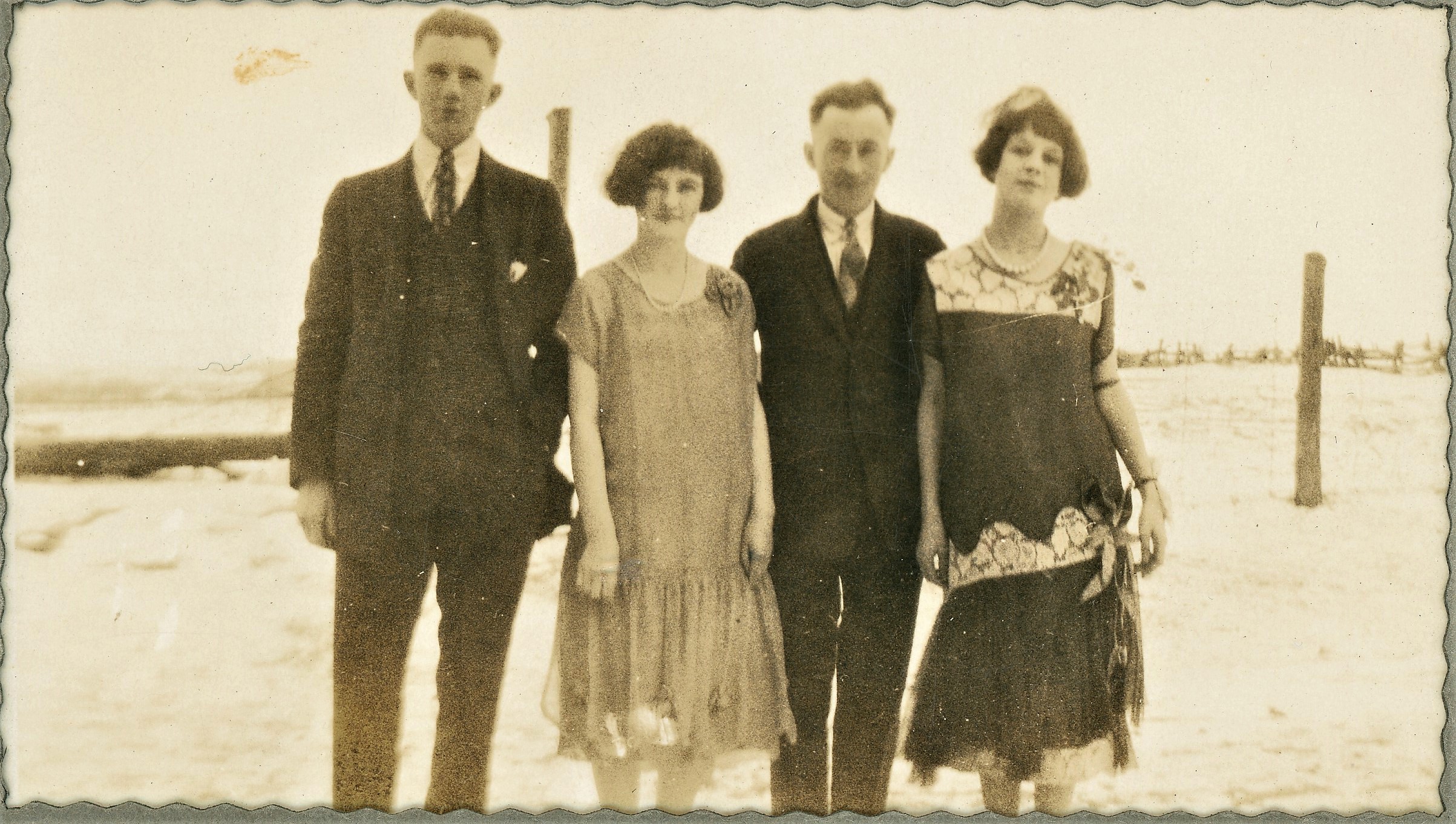 Photo of Bert Hounsome, Verlie Harris, Randolph Harris, and Edna Hounsome on the occasion of Randolph and Edna's wedding.