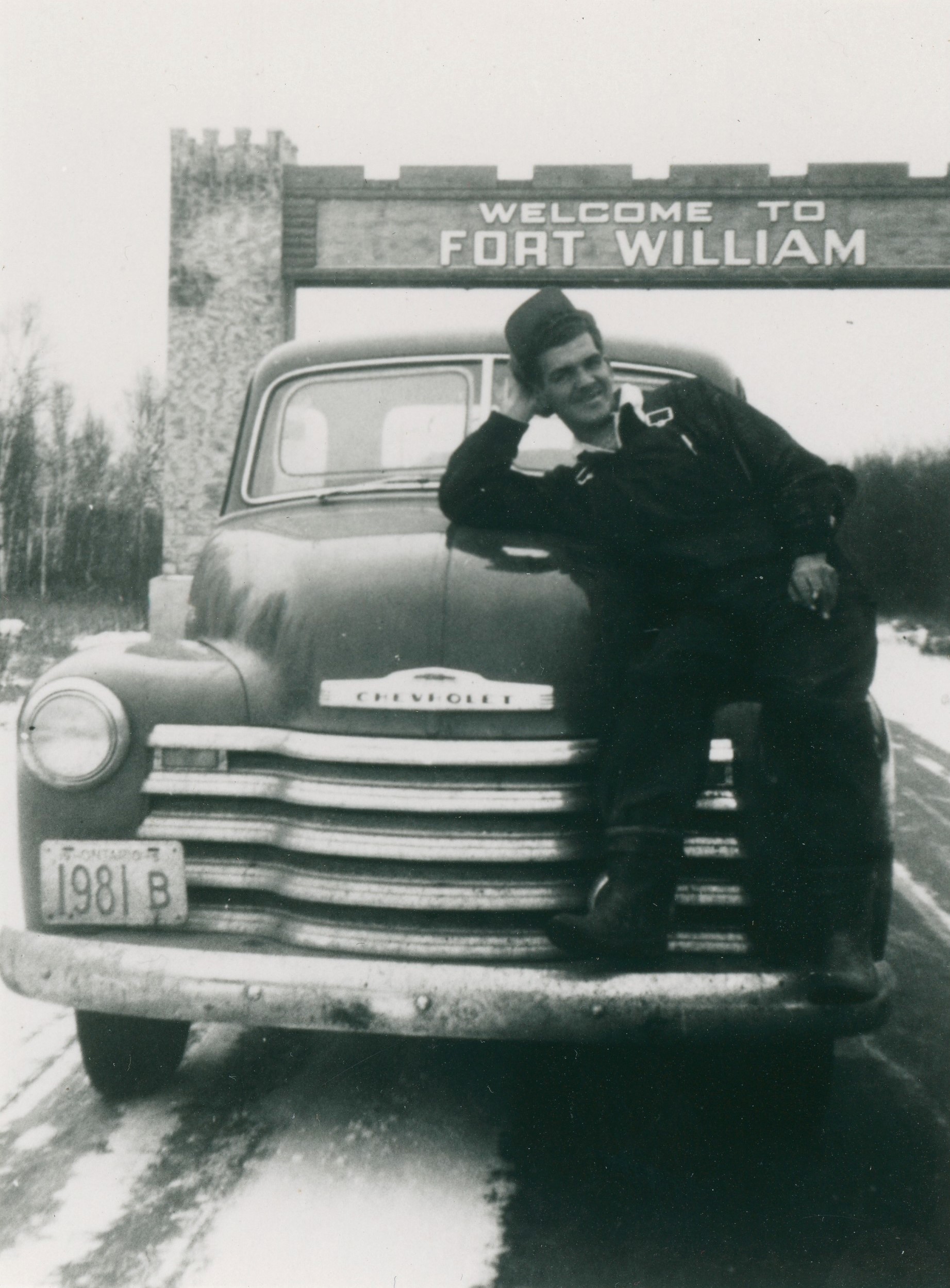 Lorne Harris leaning on truck under sign saying "Welcome to Fort William".