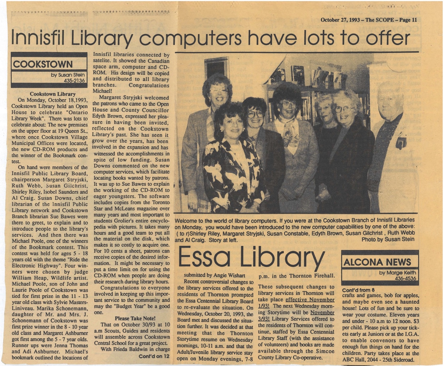 A newspaper article, written by Susan Stein of The Scope, outlining an open house event held at the Cookstown branch of Innisfil Public Library; the event celebrated the new space on the upper floor at 19 Queens Street, the new CD-ROM products, and the winner of the bookmark contest. There is a photograph attached including: Shirley Riley, Margaret Stryjski, Susan Constable, Edyth Brown, Susan Gilchrist, Ruth Webb, and Al Craig.
