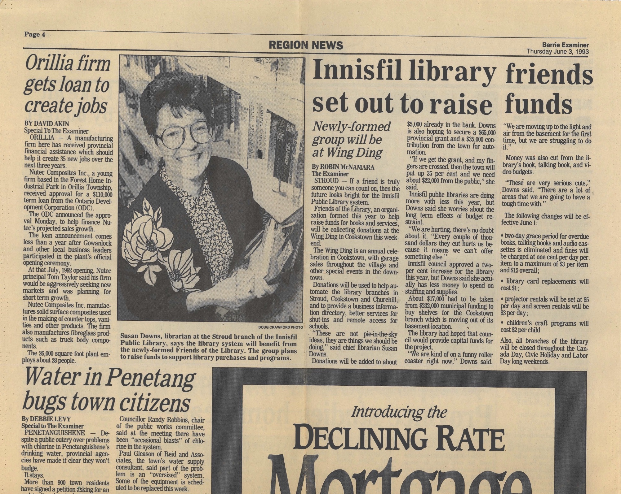 A newspaper article, written by Robin McNamara of Barrie Examiner, outlining the funding received by Innisfil Public Library, and the grant and funding acquisitions they are hoping to achieve. A photograph of Susan Downs accompanies the article.