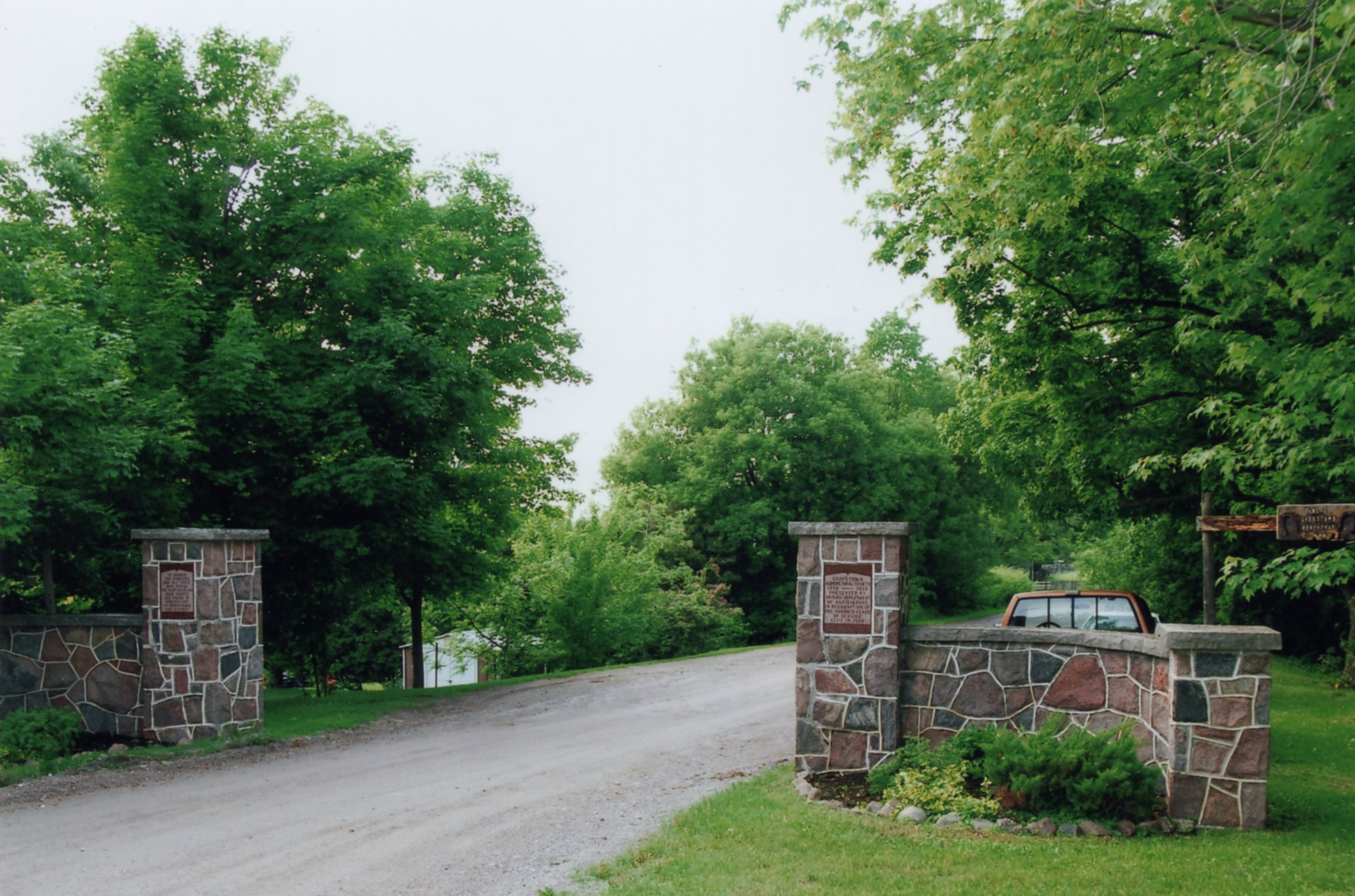 The photograph shows two brick pillar gates either side of a road leading into the Cookstown Agricultural Society grounds. There are plaques on each of the pillars; [L] "To honour the pioneers and all those who during the past 100 years have served the cause of agriculture in cookstown and district", [R] "Cookstown Agricultural Society 1858 - 1958 presented by Ontario department of agriculture in recognition of one hundered years of service Sept. 19, 1958".