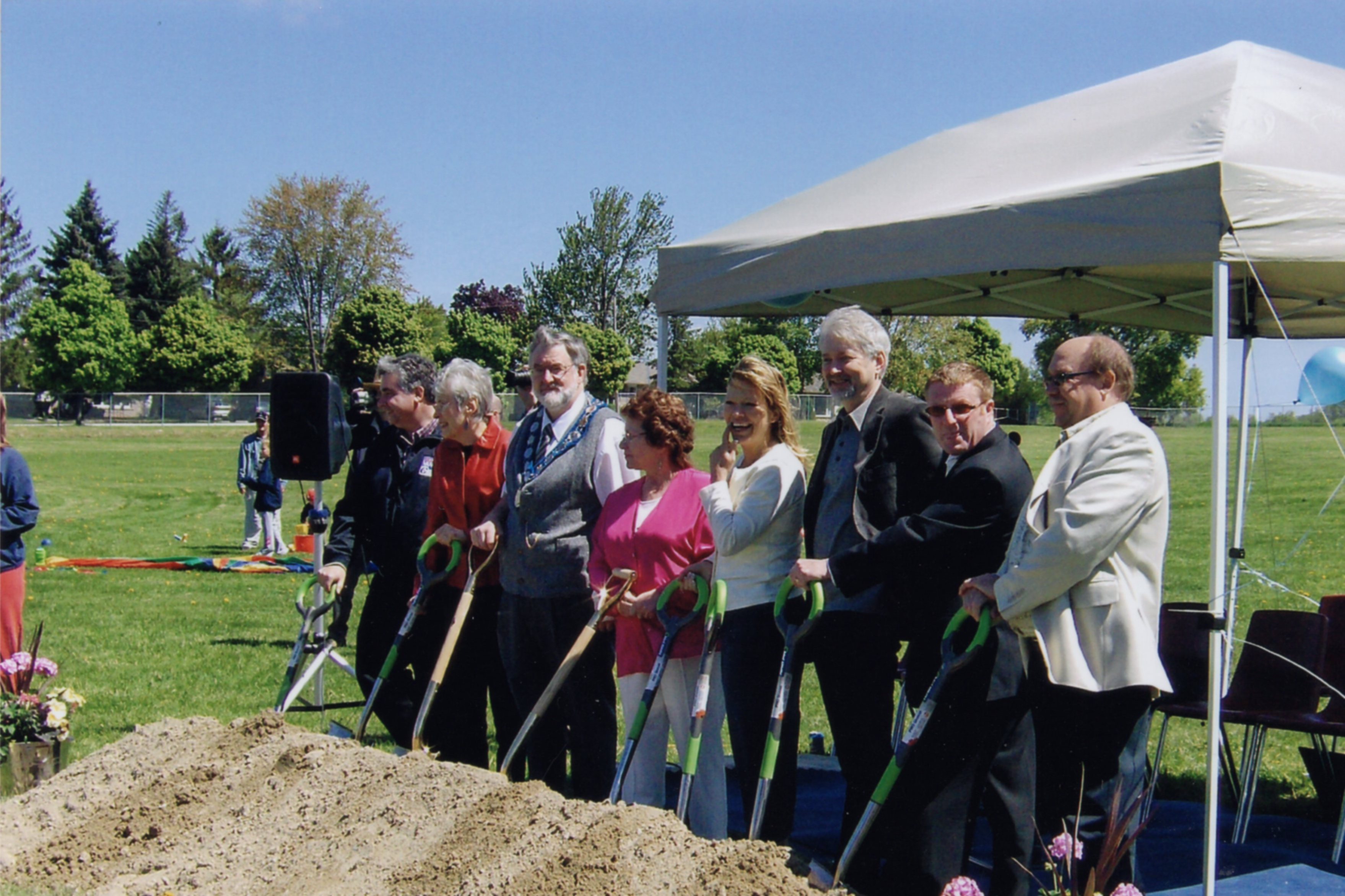 Photograph showing Town of Innisfil dignitaries at a ground breaking ceremony, it is suspected the event is related to Cookstown Agricultural Society grounds. [L-R] Peter Van Loan, Mabel Riley, Mayor Brian Jackson, Lilian Owen, Lynn Dolan, Gerry Shultz, (unknown), (unknown).