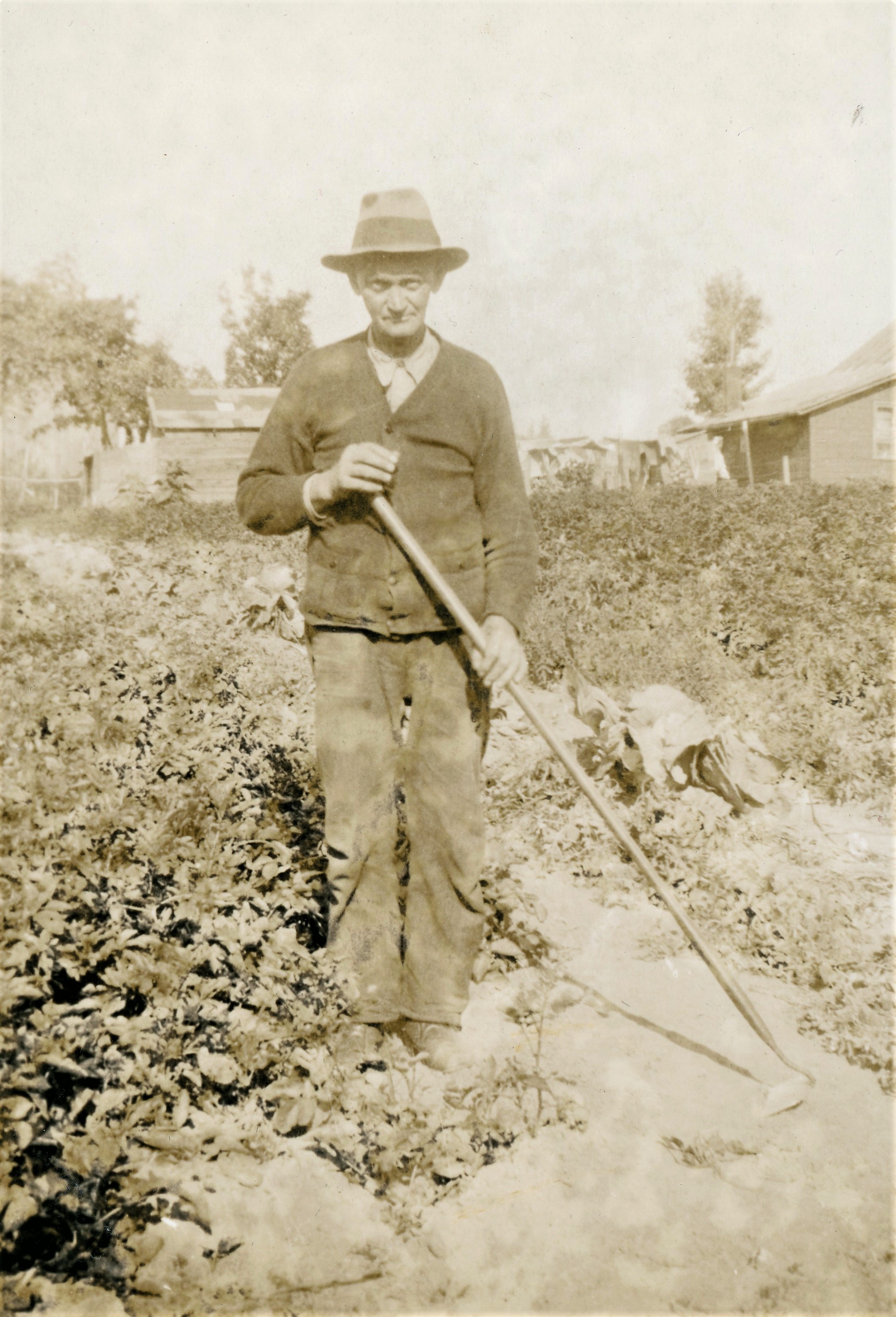 Photo of Will Harris hoeing a garden, wearing a hat and cardigan.