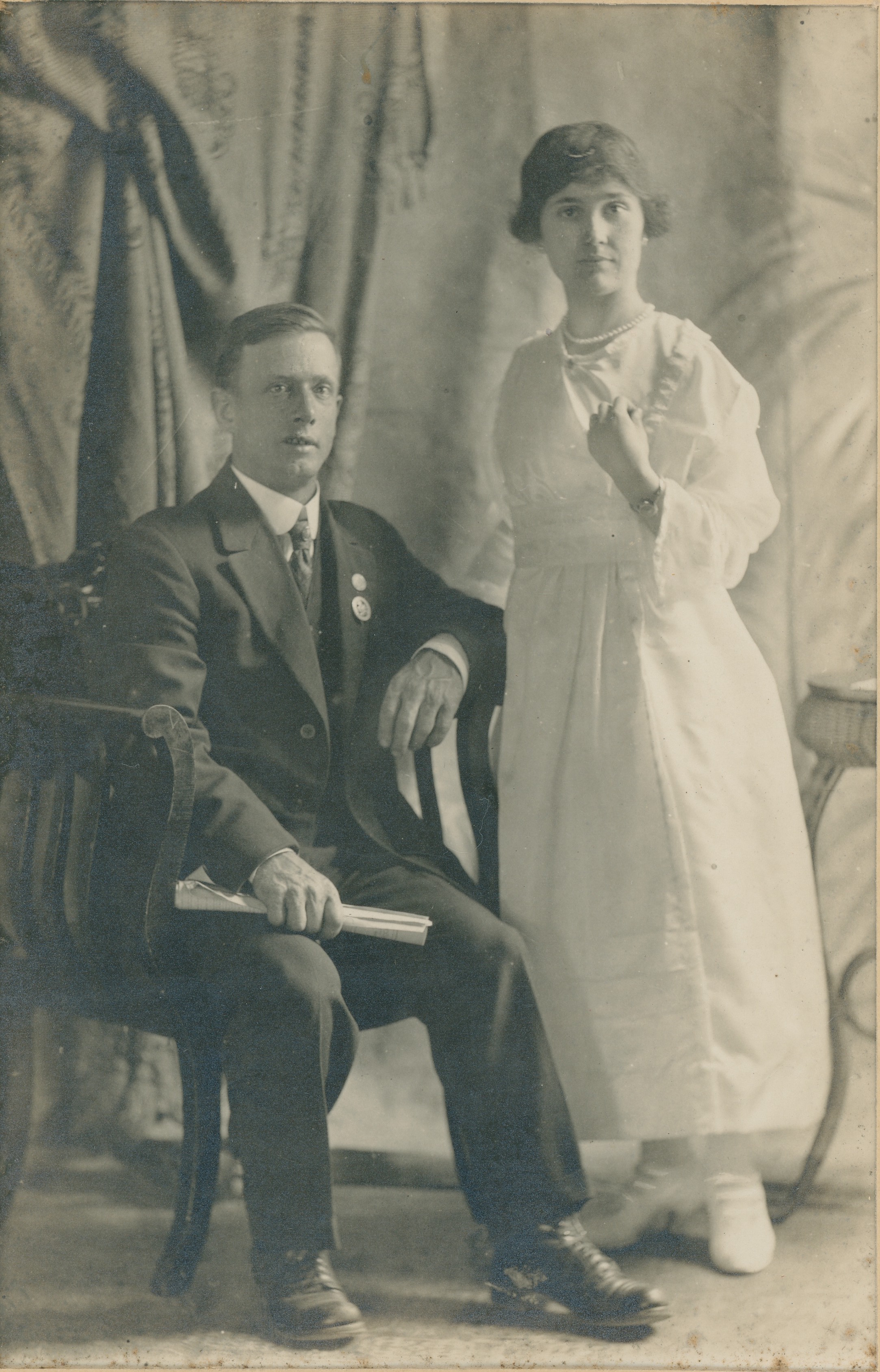 Portrait of Harry and Ruby Cannon. Harry is wearing a suit and is seated; Ruby is standing and wearing a long white dress and a pearl necklace.