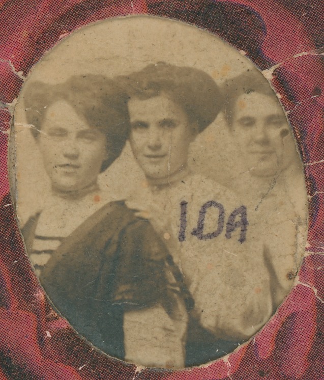 Picture of three women, one unidentified, one Ida Wellington (centre), and one Mrs. Charlie Woods, inside a small flower shaped frame.