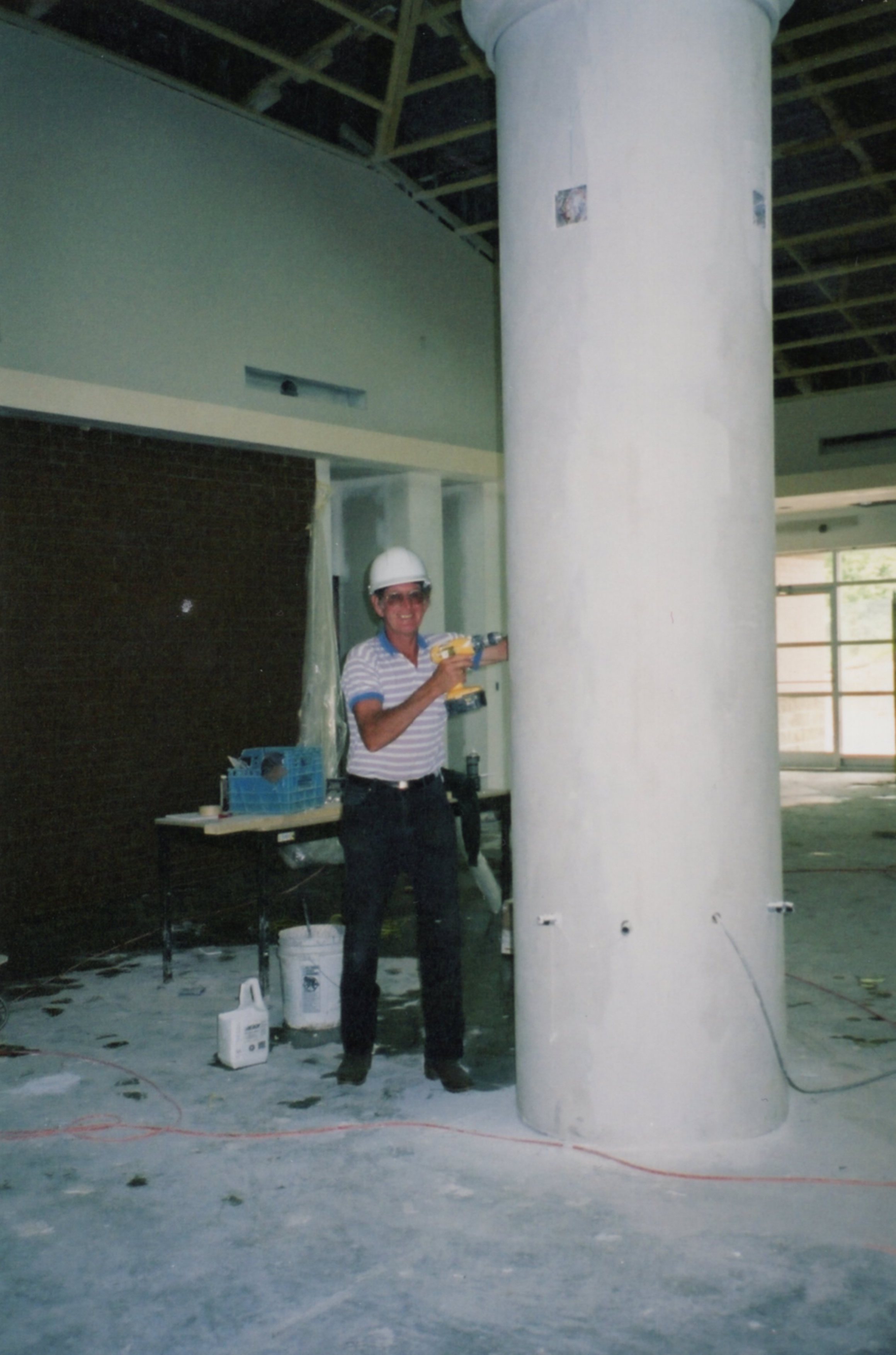 Photograph of Grant Audrade from the Town of Innisfil working on the pillar inside the Lakeshore Branch of Innisfil Public Library during the construction of the building.