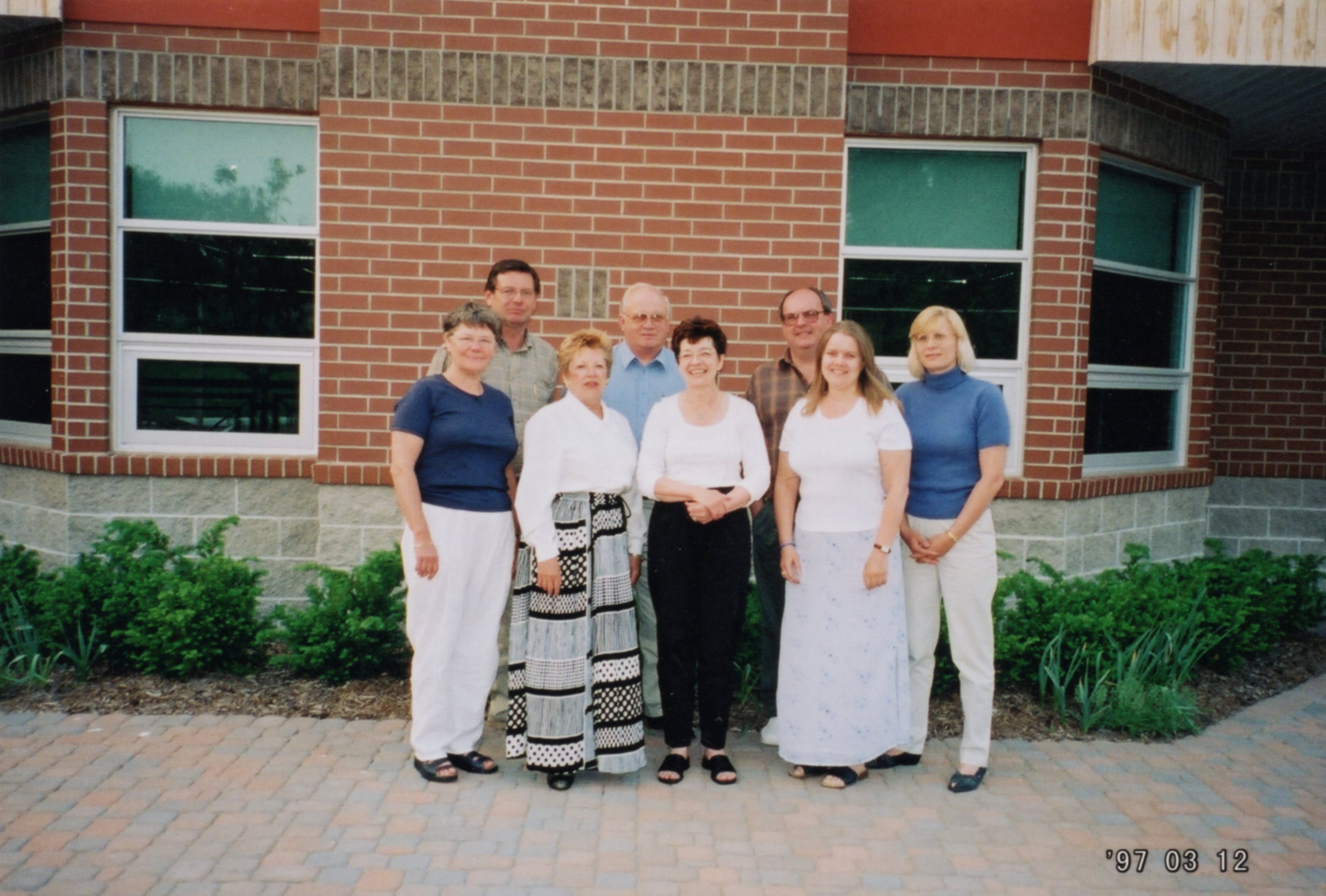 Members of the Innisfil Public Library Board standing at the back of the Lakeshore Branch in its first iteration. Pictured from left to right, back row: Bill Van Berkel, Joe Belesky, and Bruce Hain. Front row: Win Hoysa, Margaret Stryjski, Susan Downs [CEO and Chief Librarian], Asa Klint, and Anne Kell. The photo was taken on 12 March 1997.