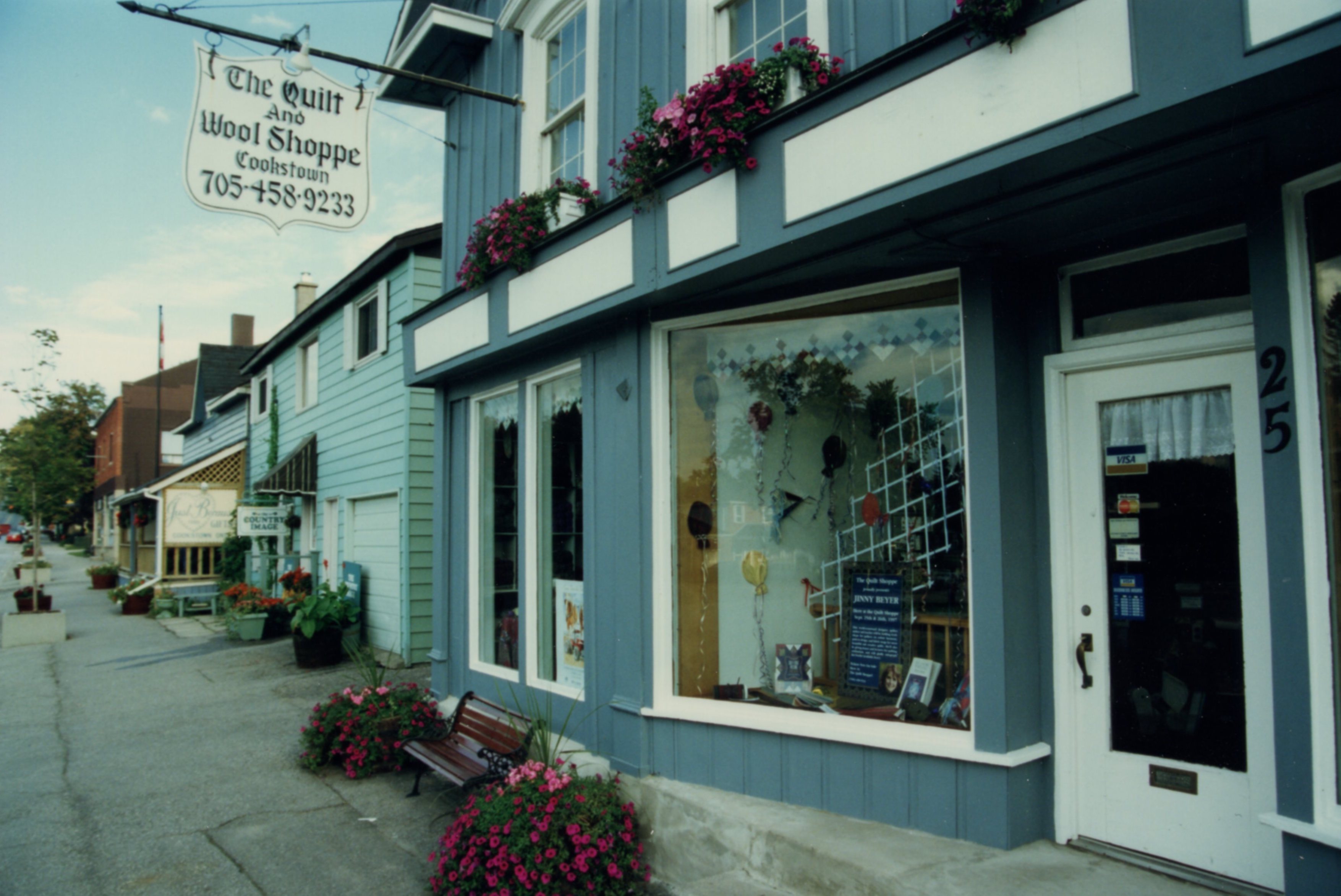 Photo of a historical house that has been turned into a store on Main Street, Cookstown. The store sells quilt and wool material, is painted blue, and has flower baskets under the second floor windows.