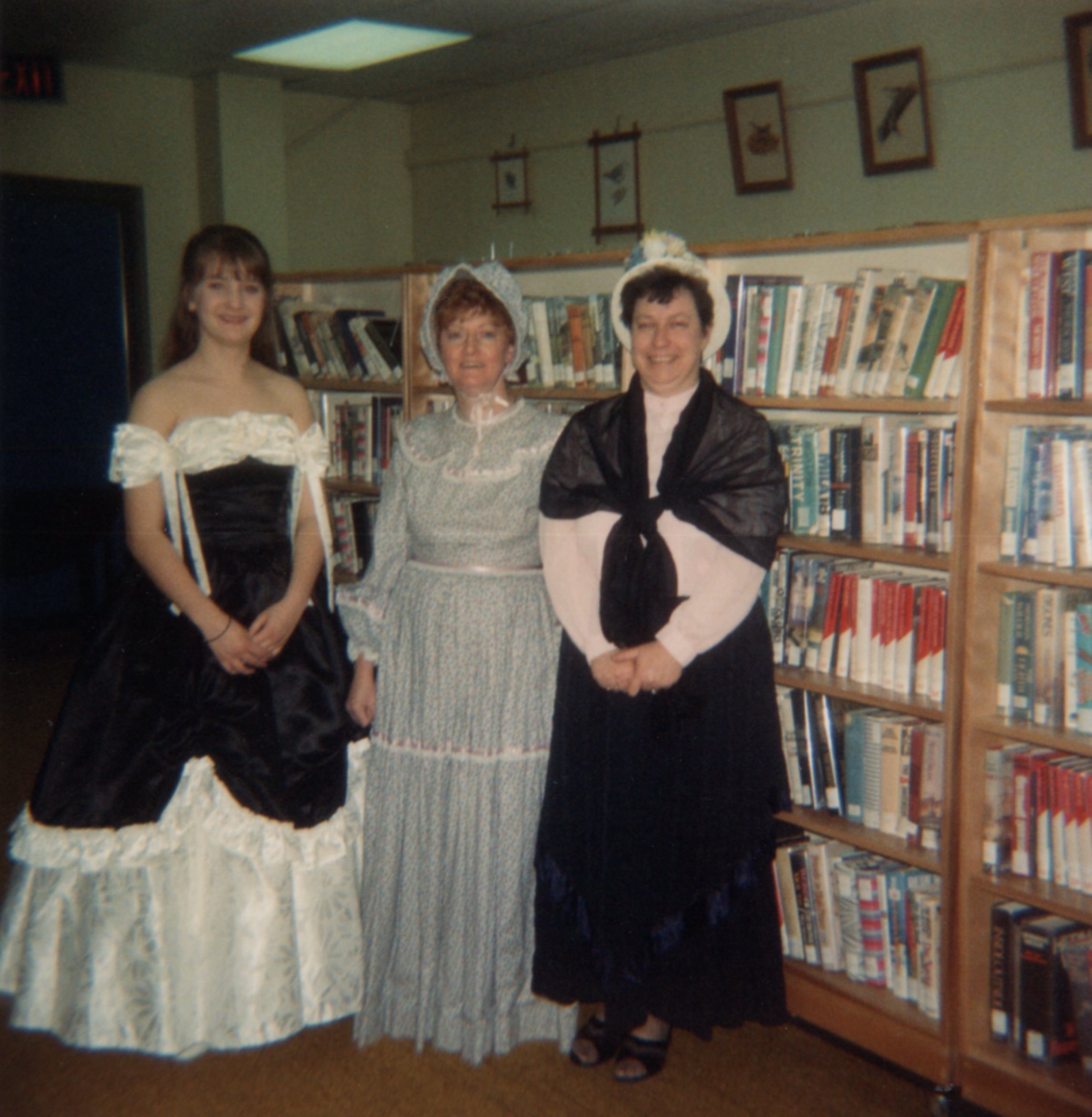 Three women dressed in mid 19th century costumes, in the Stroud Branch of Innisfil Public Library. They are participating in a centennial celebration. [L-R] Vera Roberts, Marita Hill, Edith Spence.