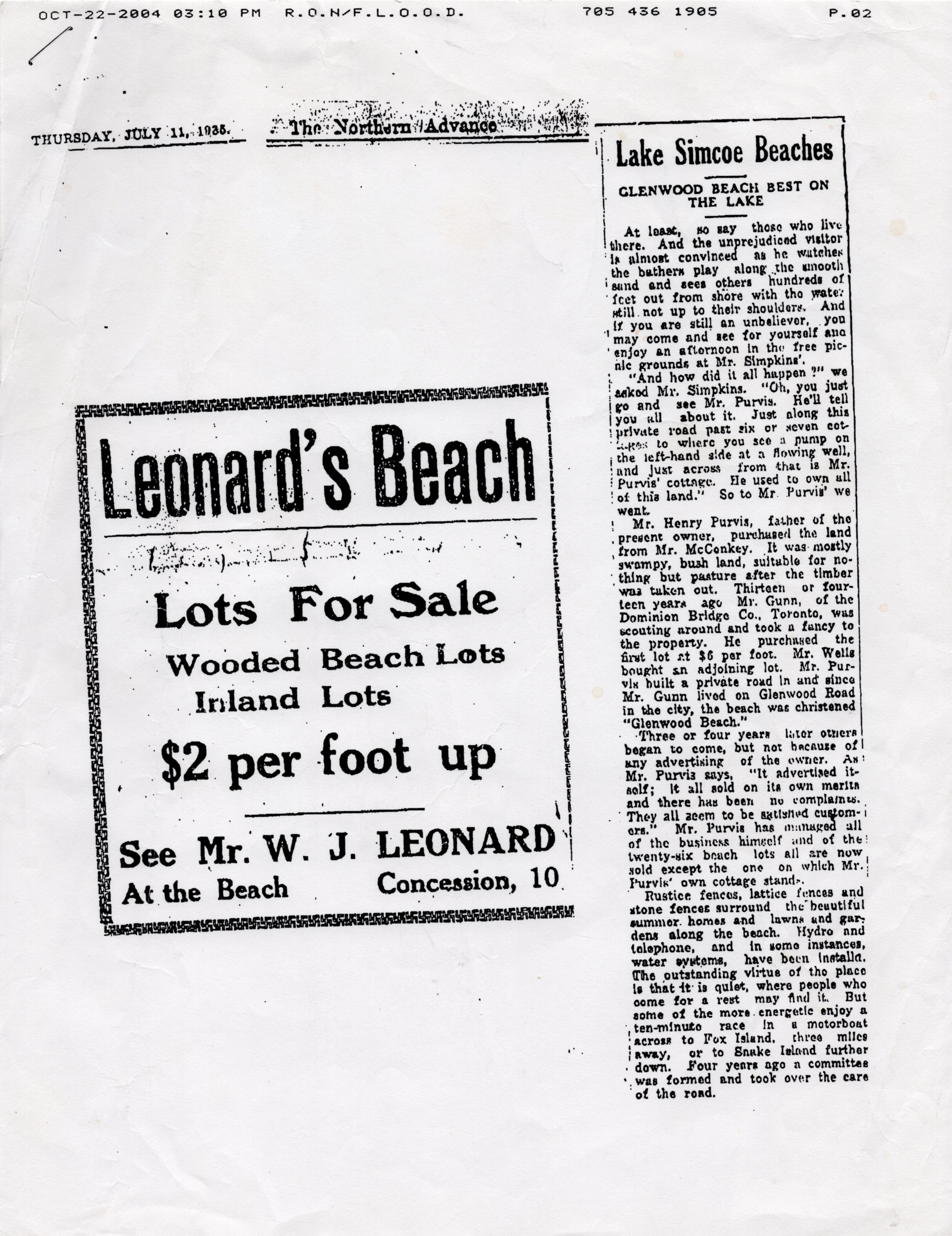 Two photocopied newspaper clippings dated Thursday, July 11th 1935 from The Northern Advance. The clipping on the left titled "Leonard's Beach" is an advertisement for wooded beach lots and inland lots. The clipping on the right discusses Glenwood Beach and how it has been dubbed the best on Lake Simcoe.