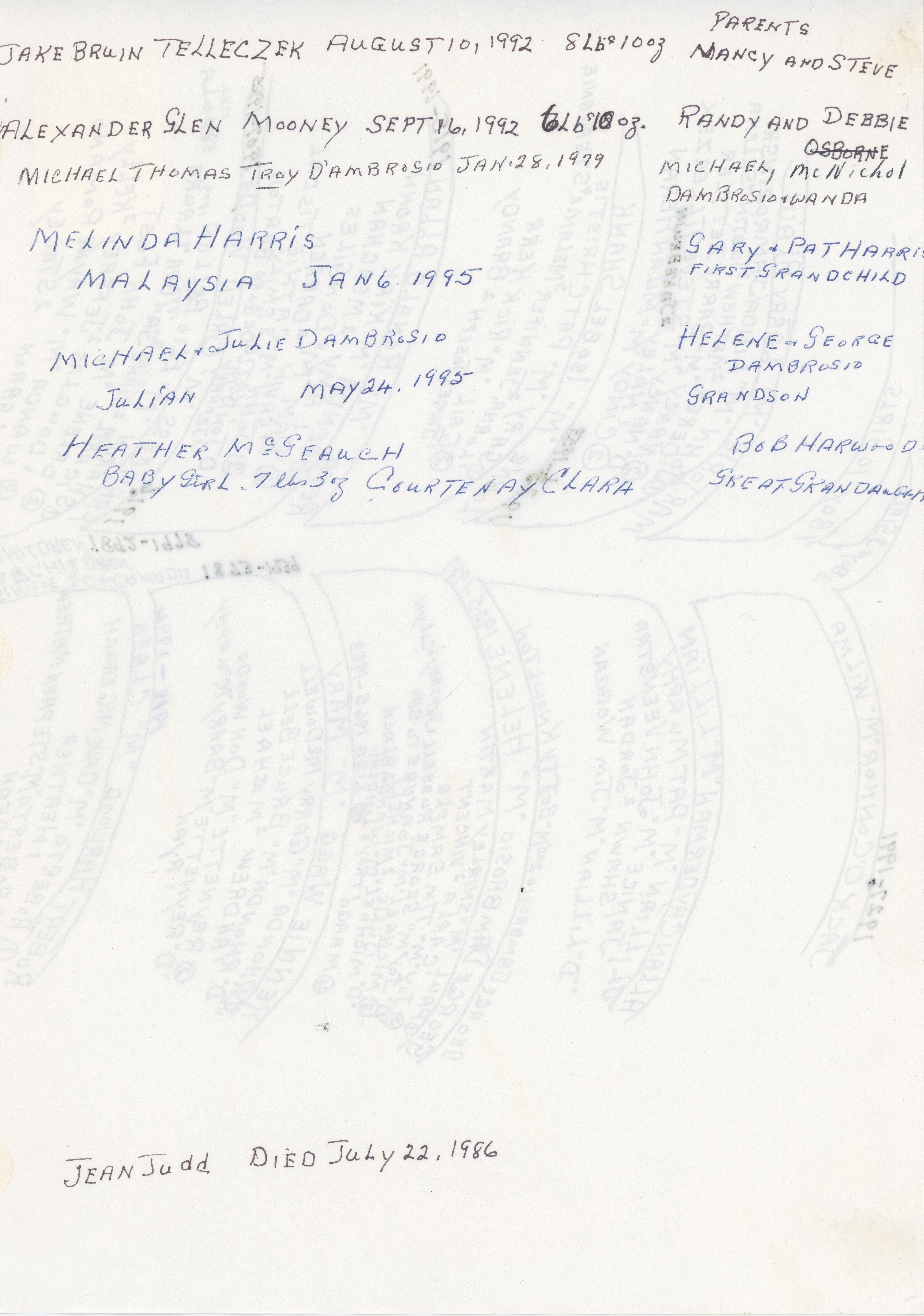 Hand printed list of births and deaths for these families; Jean Judd died July 22, 1986