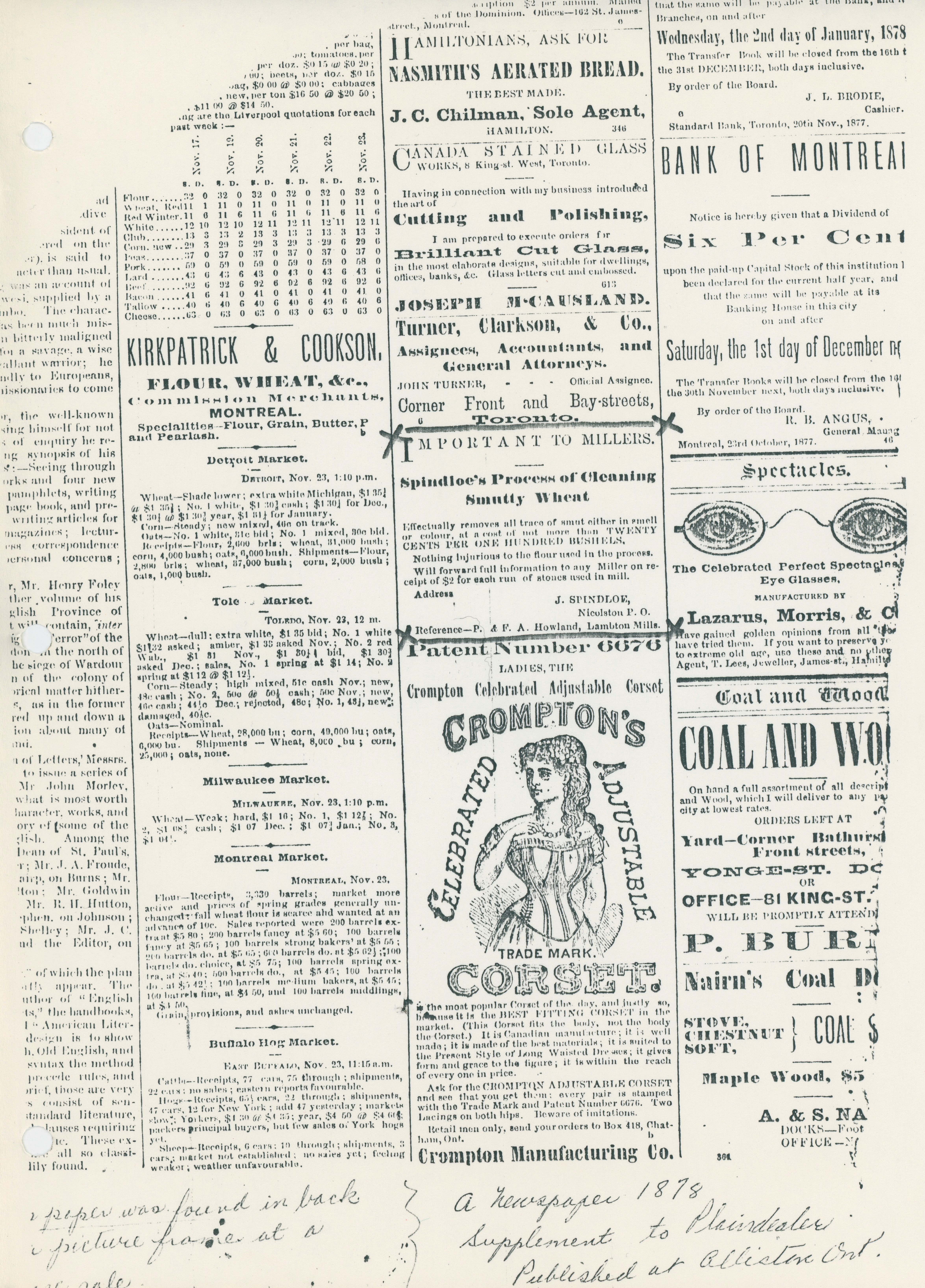 A newspaper page, dated 1878, with article advertising Spindloe process of cleaning smutty wheat; Supplement to Plaindealer published in Alliston, Ontario
