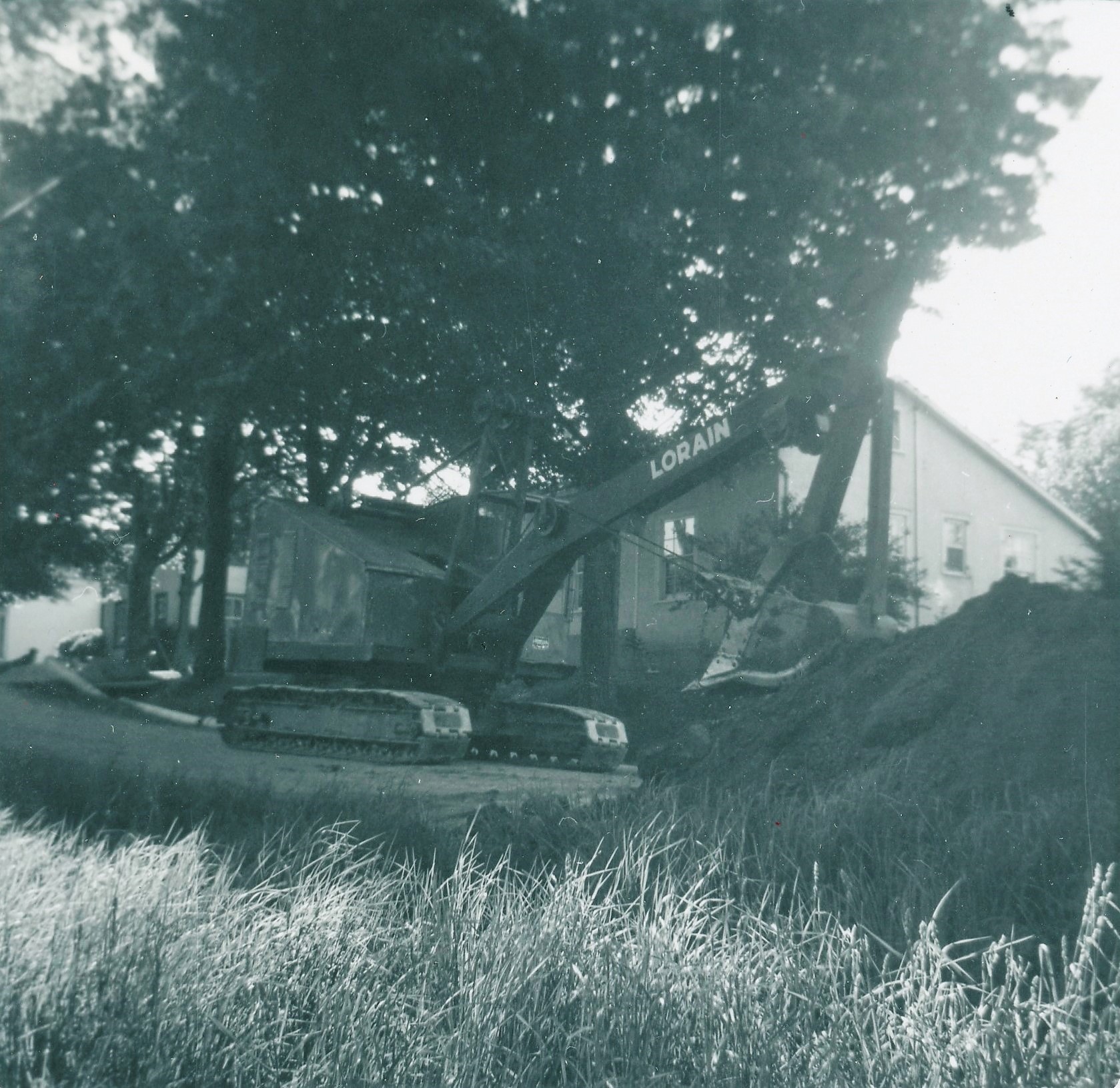 Picture of an excavator beginning the digging process for the installation of town water pipes in Cookstown, 1962.