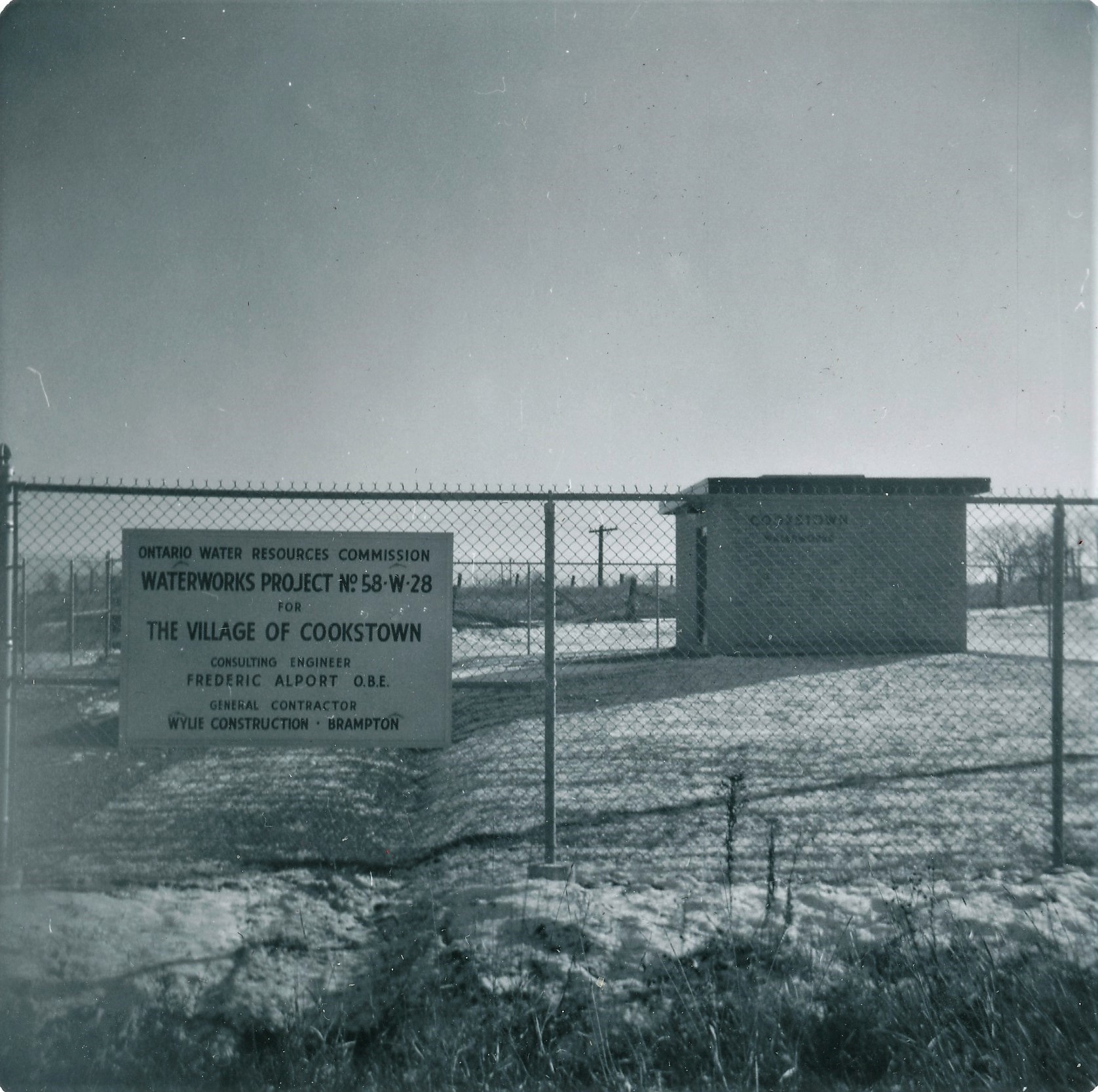 Photo of the pumphouse in Cookstown with a sign on the fence reading: "Ontario Water Resources Commission: Waterworks Project No.58-W.28 for the Village of Cookstown. Consulting engineer Frederic Alport O.B.E.; General Contractor Wylie Construction-Brampton"