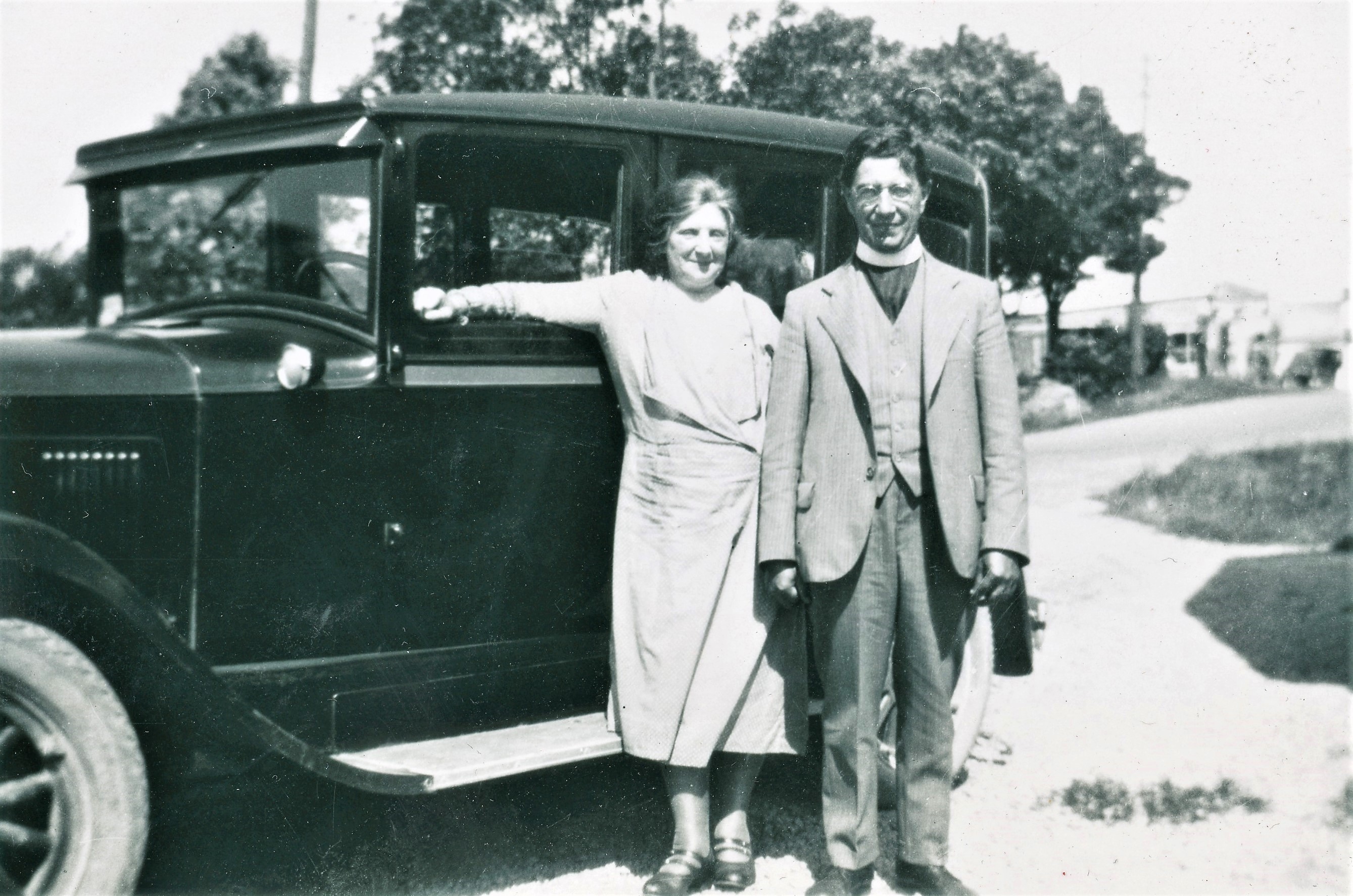 The Reverend and his wife standing beside their vintage automobile in 1959.