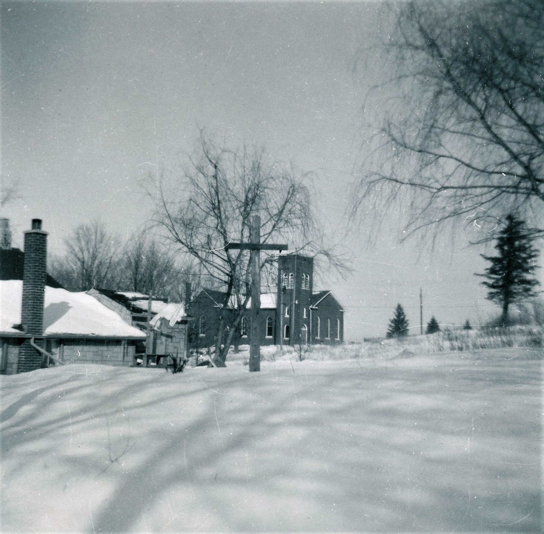 Distant view from across the street of St. John's Anglican Church in Cookstown in a snowy landscape.