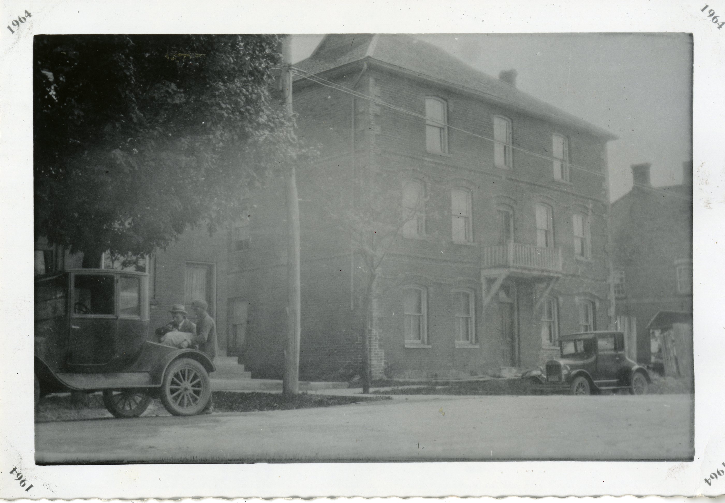 Front view of the Queen's Hotel in Cookstown, a brick building with decorative brick work on the corners, small balcony over the main door entrance, and vintage cars parked on the street outside of it.