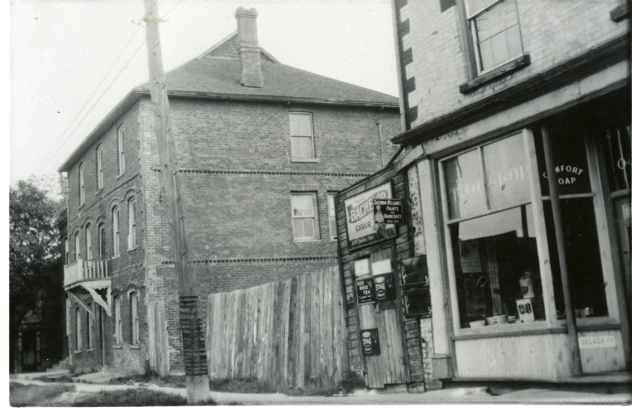 Side view of a the large square brick building known as the Queen's Hotel in Cookstown, with a view of several windows and front entranceway. Also visible on the right is Gollop's Store, with advertisements for Bachelor cigars, Red Rose tea, and Stag tobacco visible on the wooden addition to the store. The large picture window of the store is also visible with the name "T. Gollop" painted at the top.