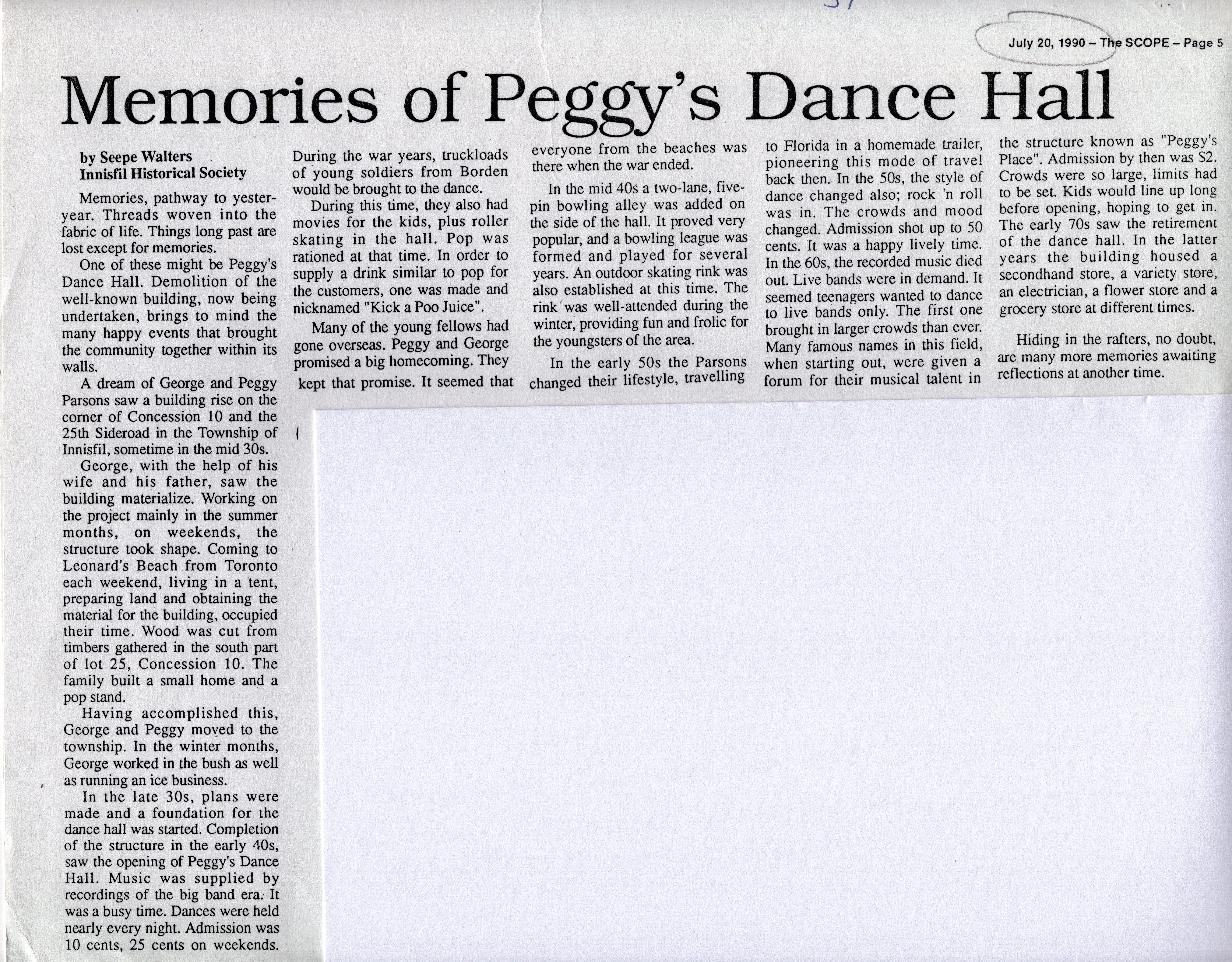 Written by Seepe Walters from Innisfil Historical Society, published in the Scope. Walters discusses the history of Peggy's Dance Hall following the demolition of the building commencing.