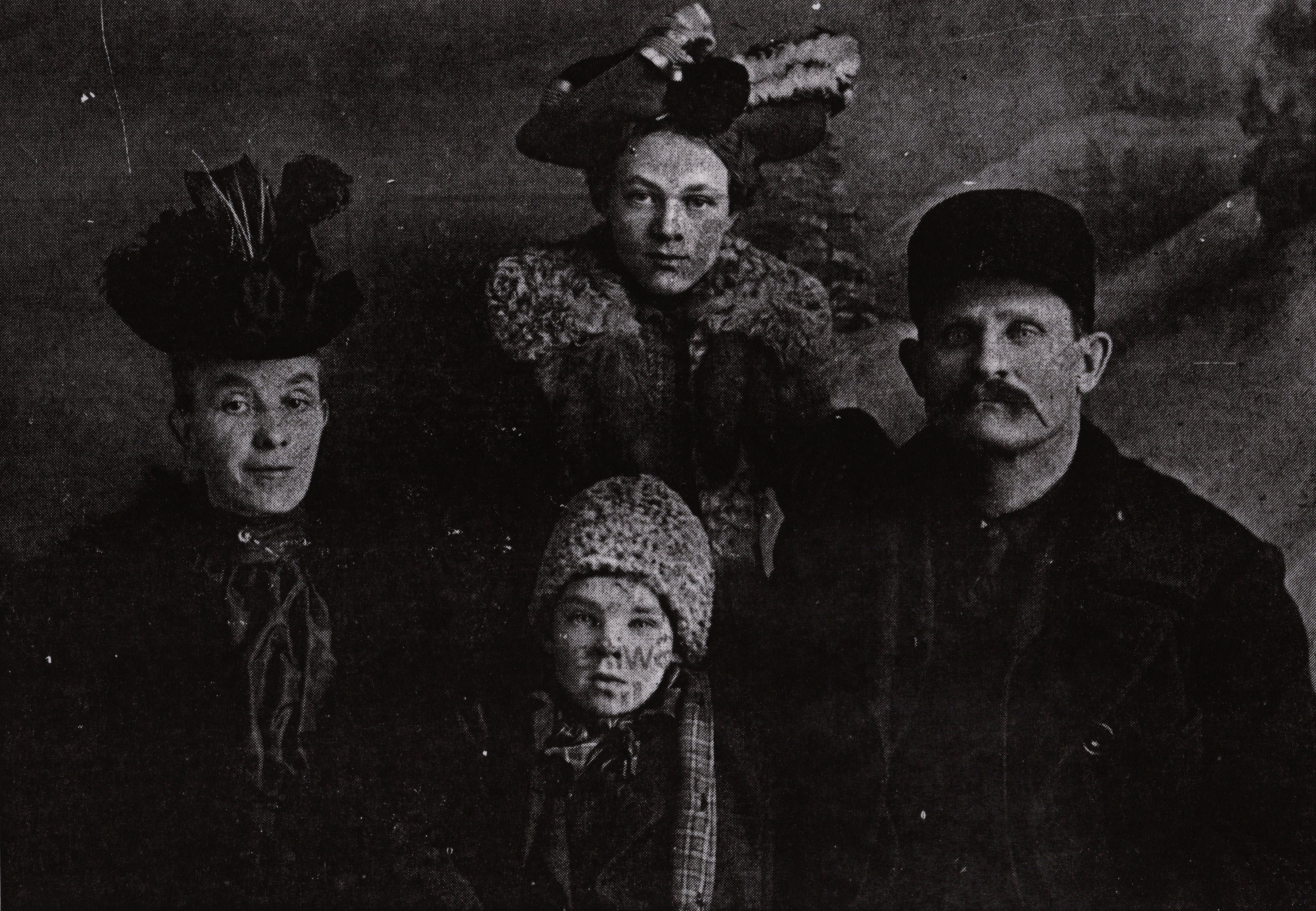 Newspaper clipping of a family portrait, with the caption "Sybil Stansfield of Bell Ewart sent us this week's photo of her great aunt and uncle Ward and Margaret Johnson who lived in that community around the turn of the century. Posing in between the well-dressed couple are their children Otto and Maud."